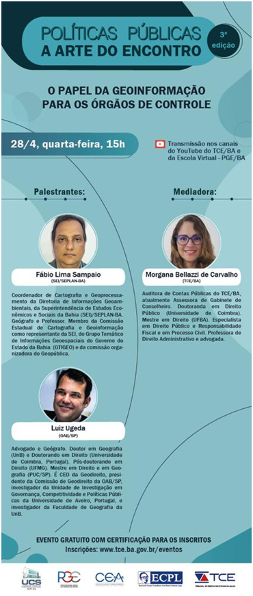 Nesta terceira edição, as apresentações terão como tema ‘O papel da geoinformação para os órgãos de controle’. Os palestrantes serão o coordenador de cartografia e geoprocessamento da Diretoria de Informações Geoambientais da Superintendência de Estudos Econômicos e Sociais da Bahia, Fábio Lima Sampaio, e o advogado e geógrafo Luiz Ugeda. A mediação ficará a cargo da auditora de contas públicas do TCE/BA Morgana Bellazzi de Carvalho.