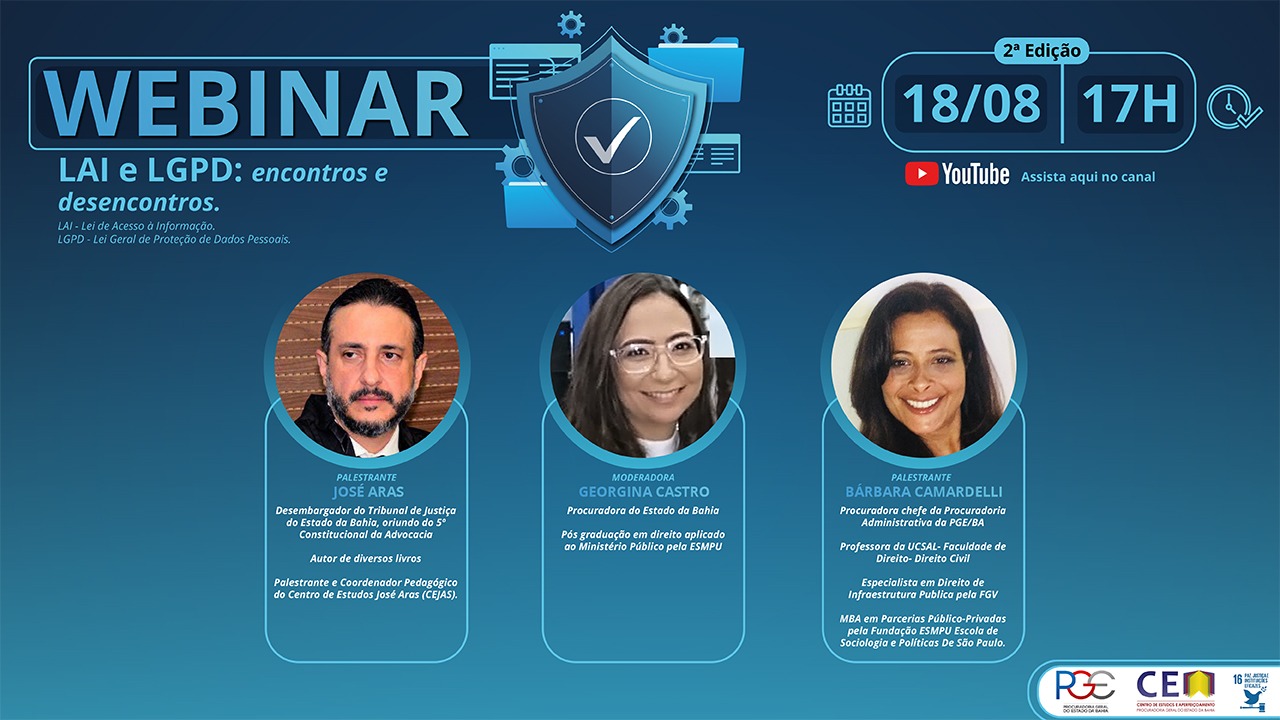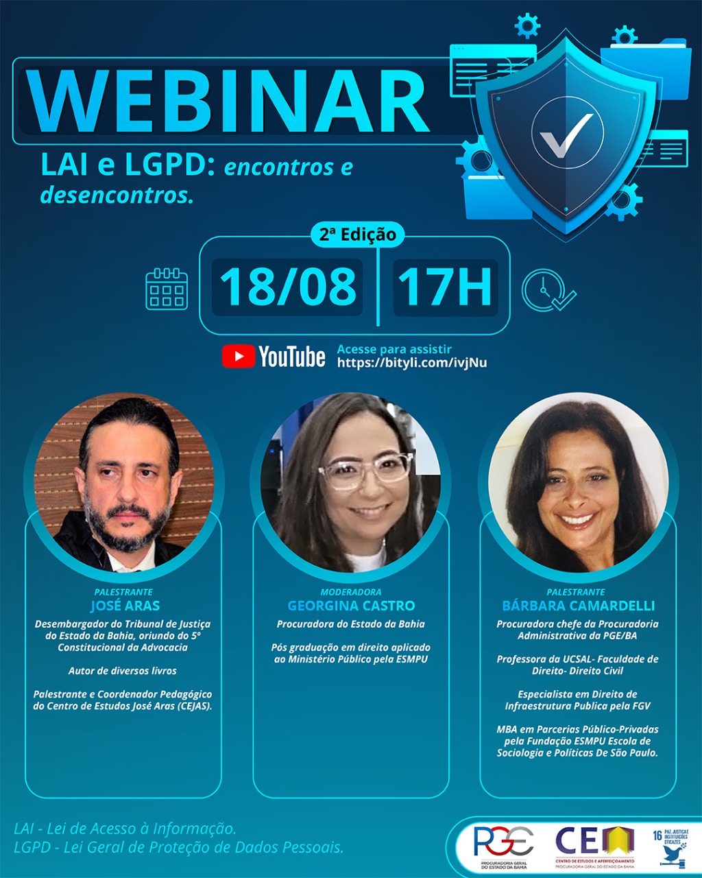 A Procuradoria Geral do Estado da Bahia realiza, no próximo dia 18, às 17h, mais um webinar sobre Proteção de Dados na Administração Pública. Desta vez, o tema será ‘LAI e LGPD: encontros e desencontros’. Para assistir acesse o link https://bityli.com/ivjNu