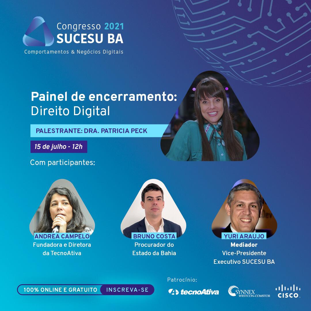 Bruno Costa participará da mesa de encerramento do congresso, que abordará o tema Direito Digital, no dia 15 de julho, às 12h, e terá como palestrante a especialista Patrícia Peck, além dos debatedores Andrea Campelo e Yuri Araújo, que abordaram os aspectos contemporâneos do direito Digital, além de temas como comportamento digital, cibersegurança e proteção de dados.