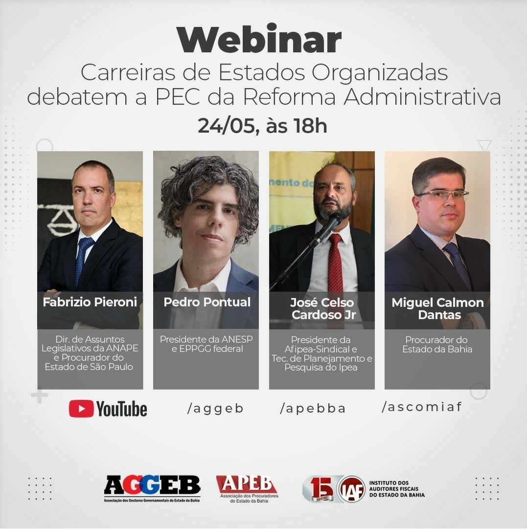 O procurador do Estado da Bahia Miguel Calmon Teixeira de Carvalho Dantas participa, no próximo dia 24, às18h, do webinar ‘Carreiras de Estados Organizadas debatem a PEC da Reforma Administrativa’. O evento terá transmissão simultânea pelos canais Associação dos Gestores Governamentais do Estado da Bahia (AGGEB), da Associação dos Procuradores do Estado da Bahia (APEB) e do Instituto dos Auditores Fiscais do Estado da Bahia (IAF), no YouTube.