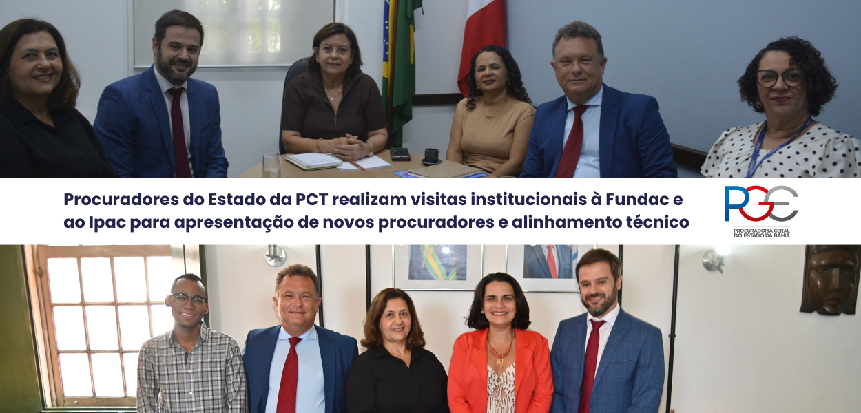 Com o objetivo de promover o alinhamento institucional e apresentar formalmente os procuradores designados para atuar junto à Fundação da Criança e do Adolescente (Fundac) e ao Instituto do Patrimônio Artístico e Cultural da Bahia (Ipac), integrantes da Procuradoria de Controle Técnico (PCT), da Procuradoria Geral do Estado da Bahia (PGE-BA), realizaram ontem, (07), visitas institucionais aos dois órgãos.