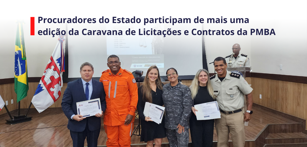 Na última quarta-feira, (27), os procuradores do Estado Maria do Carmo Freaza Garcia, Celi Conceição Gomes Guimarães e Carlos Augusto Ferreira Santos Ahringsmann marcaram presença em mais uma edição da Caravana de Licitações e Contratos, realizada no quartel do Comando-Geral da Polícia Militar da Bahia (PMBA). O evento é fruto de uma parceria de longa data entre a PMBA e a Procuradoria Geral do Estado da Bahia (PGE-BA), com o objetivo de orientar pregoeiros e comissões de licitação sobre a nova Lei Federal de Licitações e Contratos, além de instruir os processos administrativos com maior segurança jurídica.