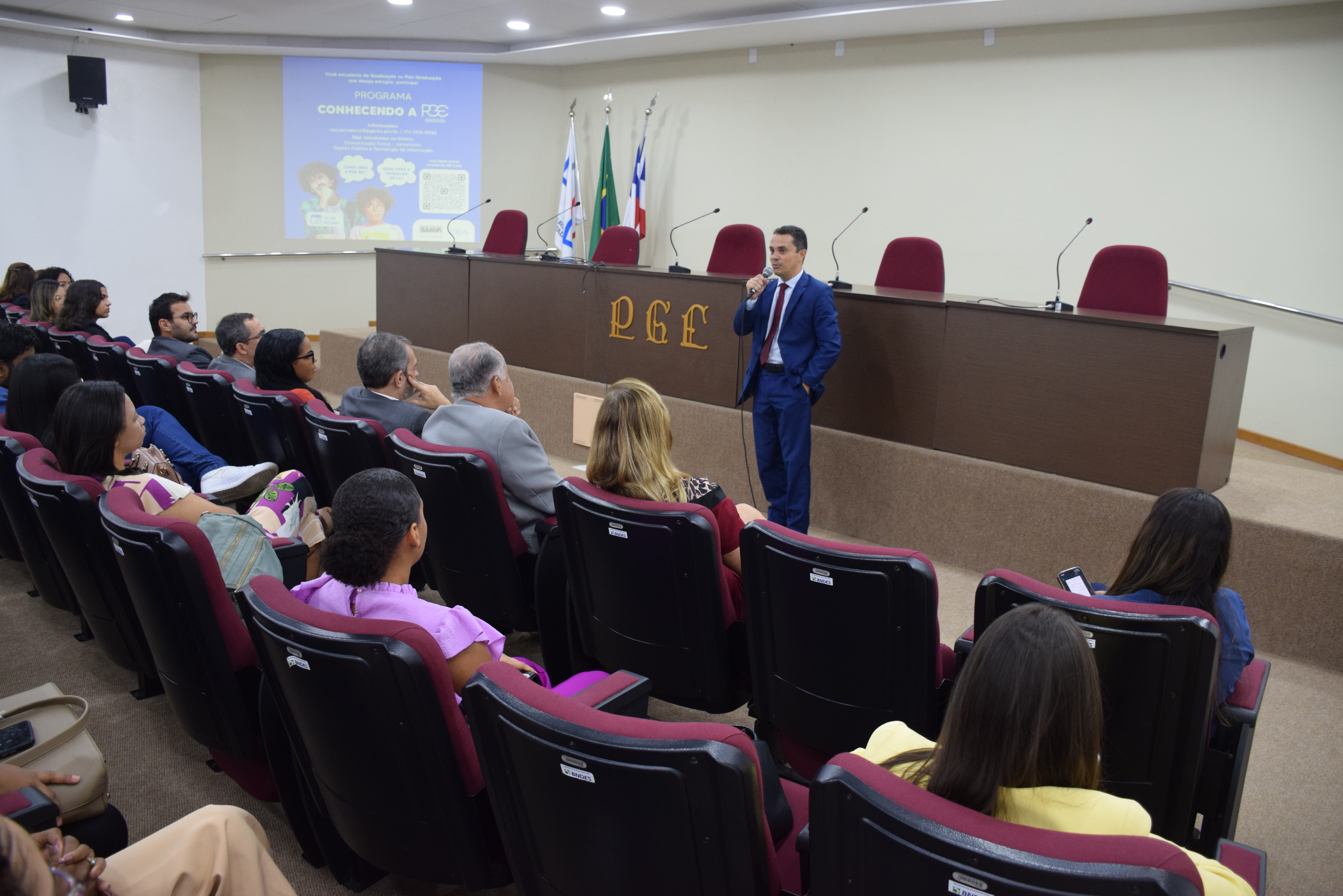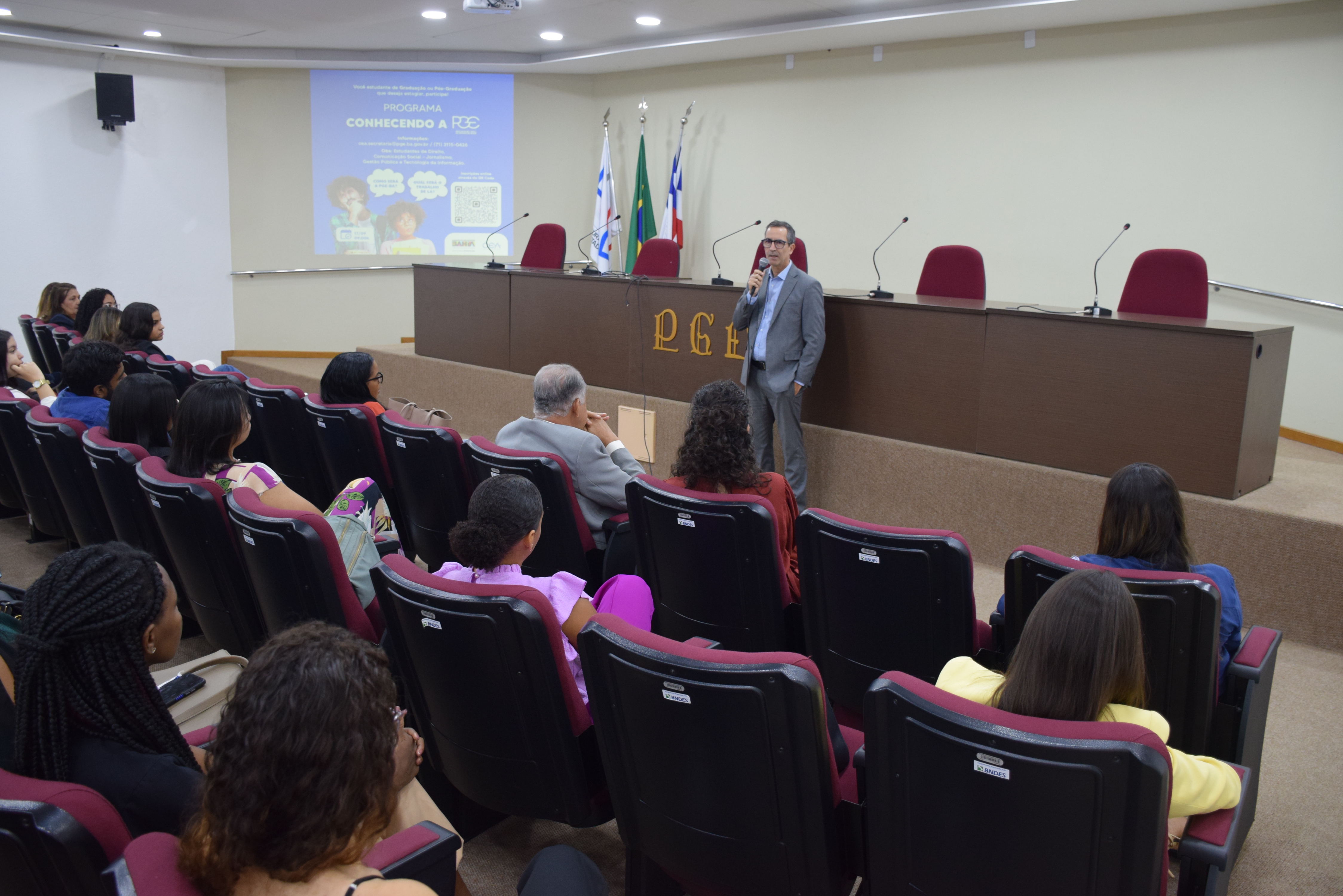 Nesta terça-feira (17) pela manhã, a Procuradoria Geral do Estado da Bahia (PGE-BA) recebeu estudantes de graduação e pós-graduação dos cursos de Direito, Comunicação Social – Jornalismo, Gestão Pública e Tecnologia da Informação de diversas faculdades e universidades. O programa Conhecendo a PGE proporciona aos participantes uma compreensão abrangente das atividades desempenhadas pelo órgão e suas áreas de atuação, assim como do papel dos advogados públicos estaduais.
