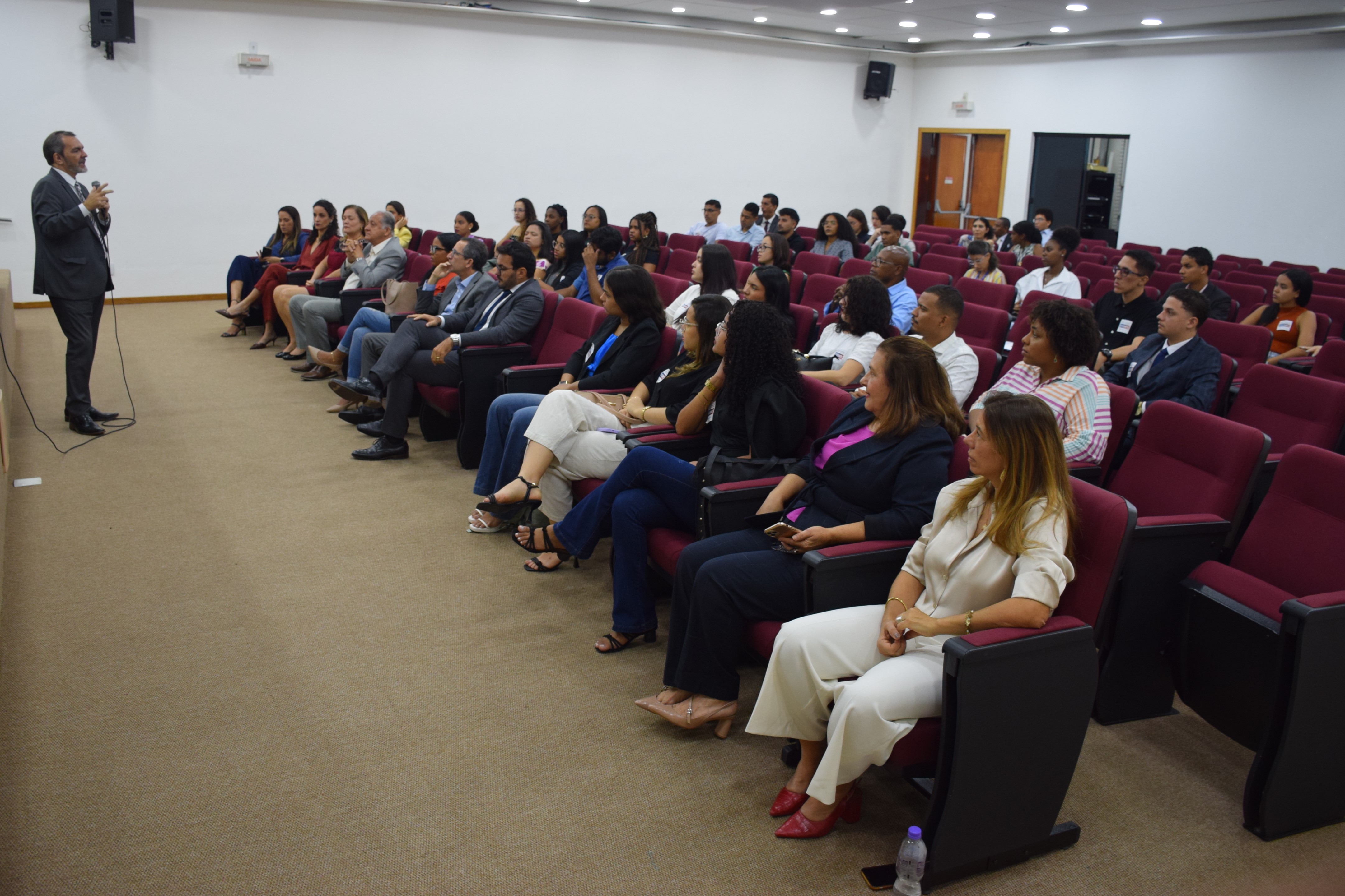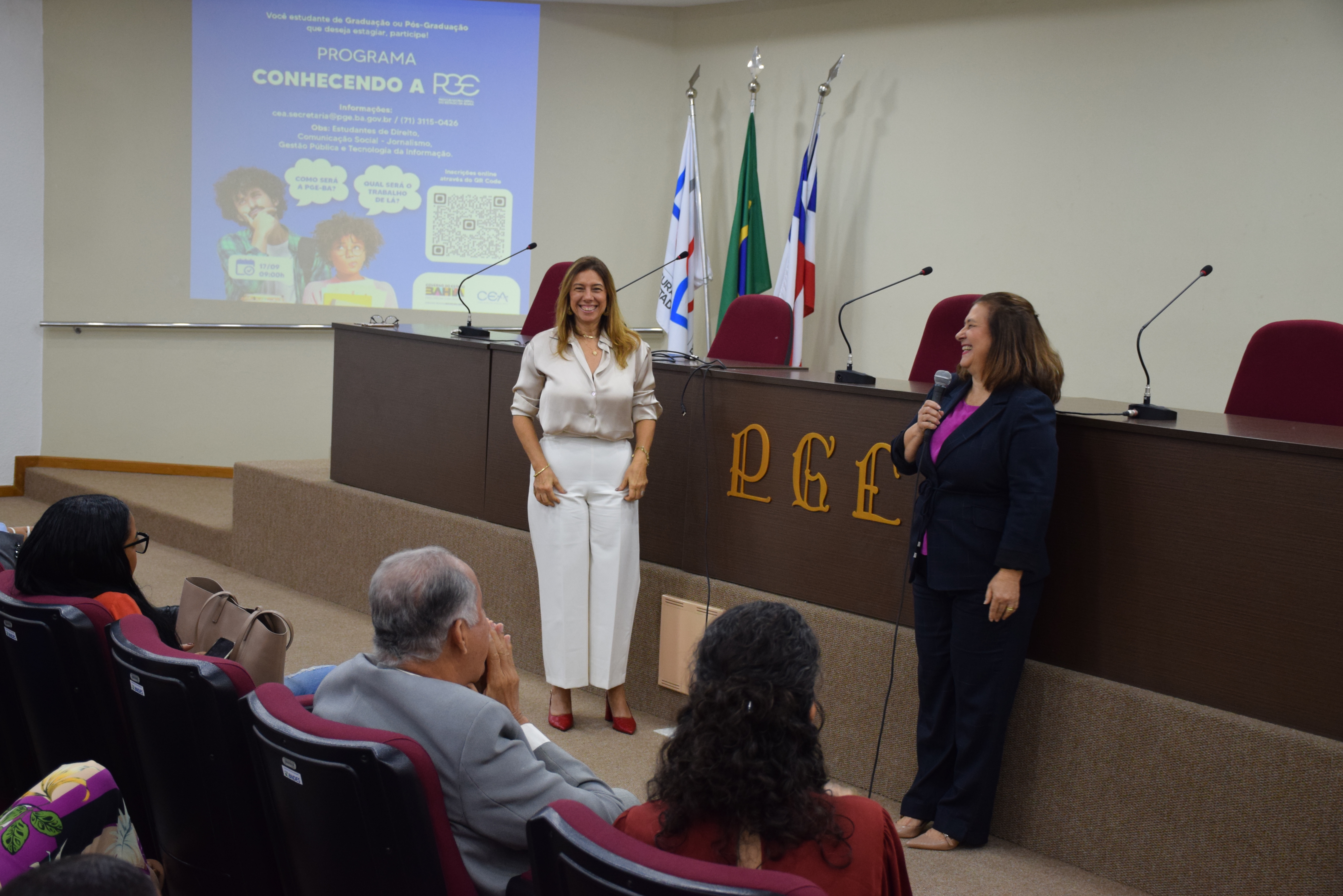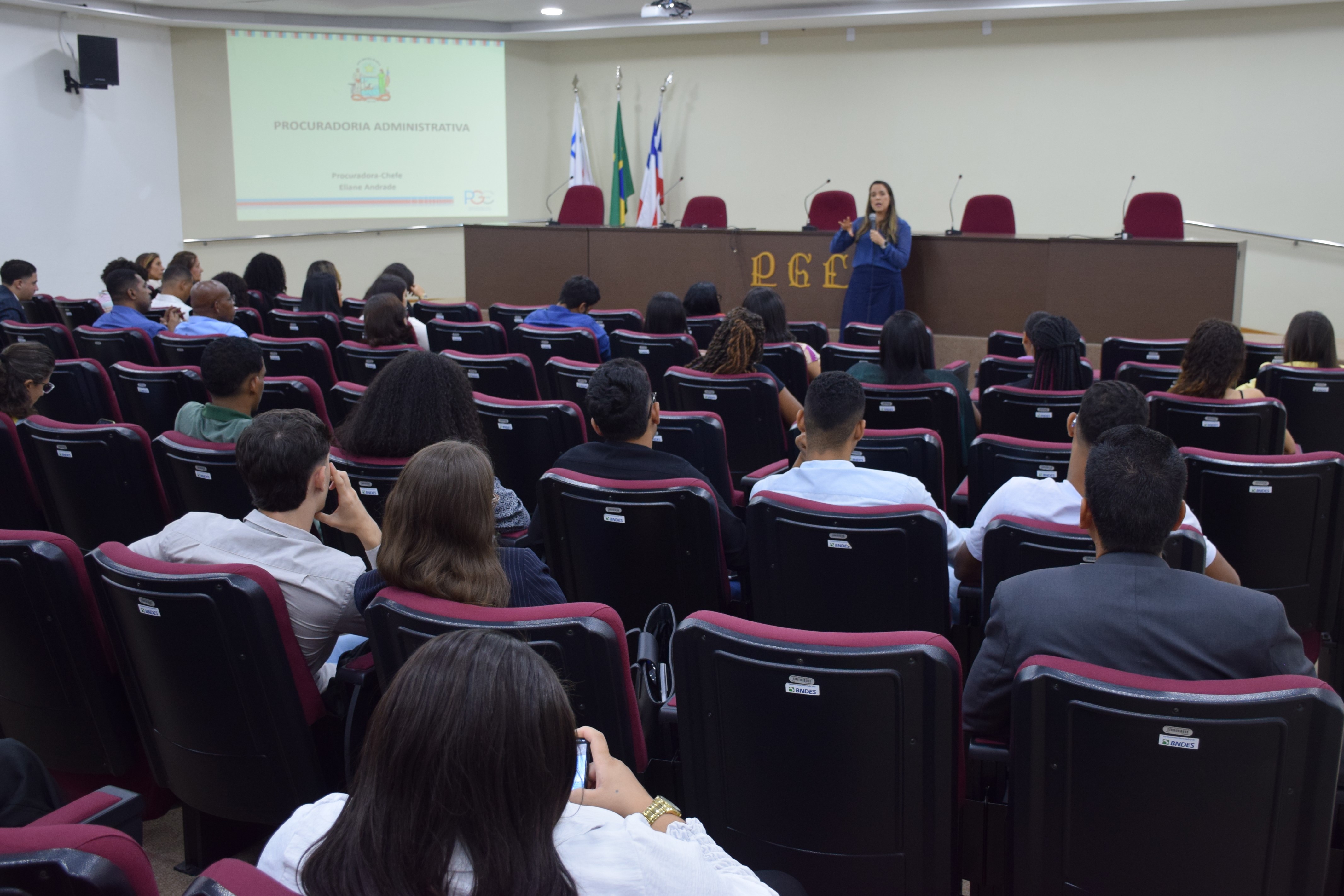 A Procuradora Chefe do Centro de Estudos e Aperfeiçoamento (CEA), Ivana Pirajá, saudou os estudantes e falou sobre a importância da visita: "Sei que todos conhecem o que o promotor ou defensor faz, mas poucos conhecem o trabalho da Procuradoria. Espero que vocês saiam daqui entusiasmados com a advocacia pública". A Procuradora Assistente do Núcleo de Controle Administrativo e Disciplinar da Procuradoria Administrativa, Fabiana Barretto, falou sobre a importância do estágio na PGE-BA para sua decisão de carreira: "Fui estagiária da PGE e a experiência aqui me abriu caminhos, pois eu já tinha estagiado em escritório de advocacia e não me identifiquei", disse. Hoje, como procuradora da PA, ela pode prestar consultoria e assessoramento jurídico em todas as matérias do Estado.