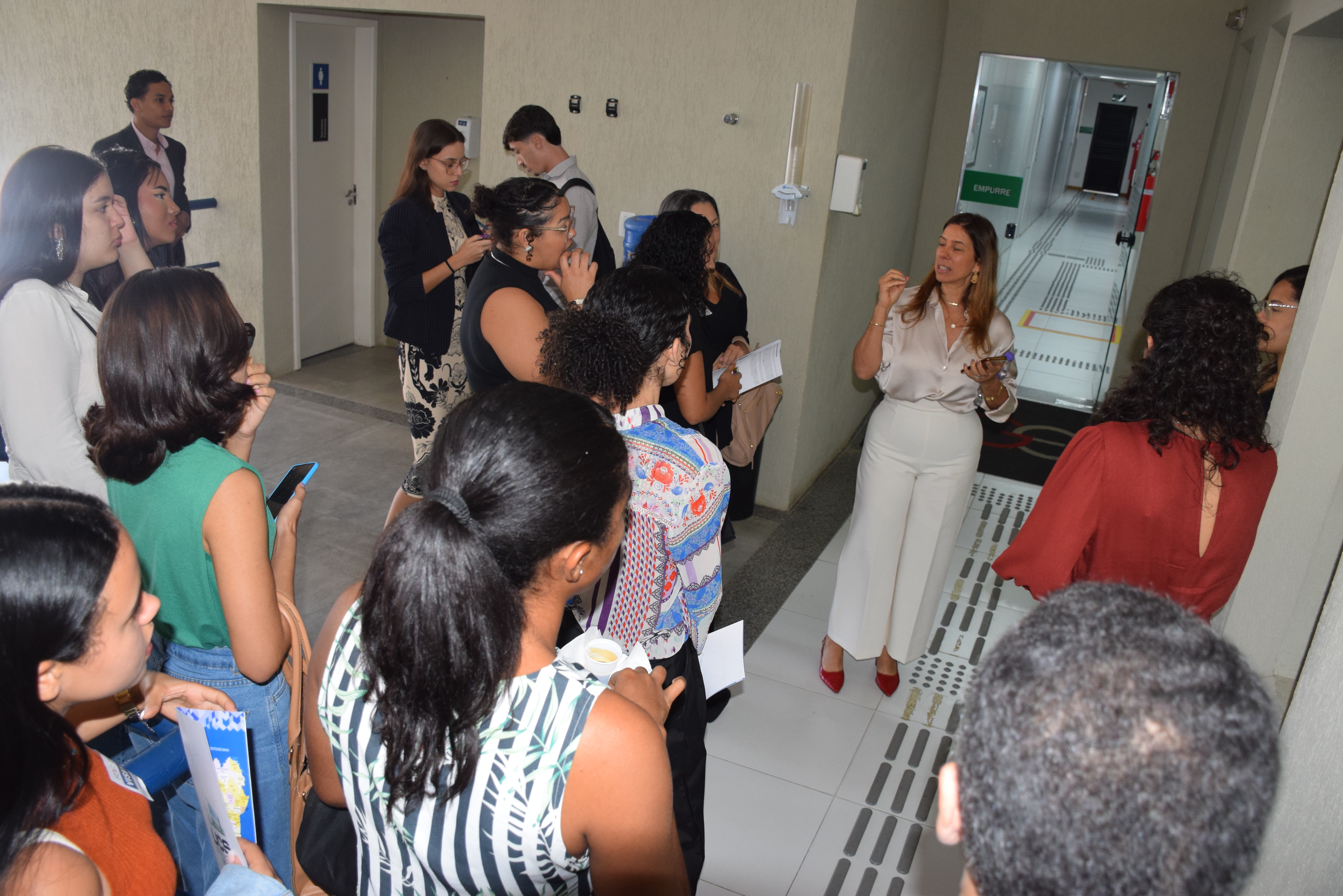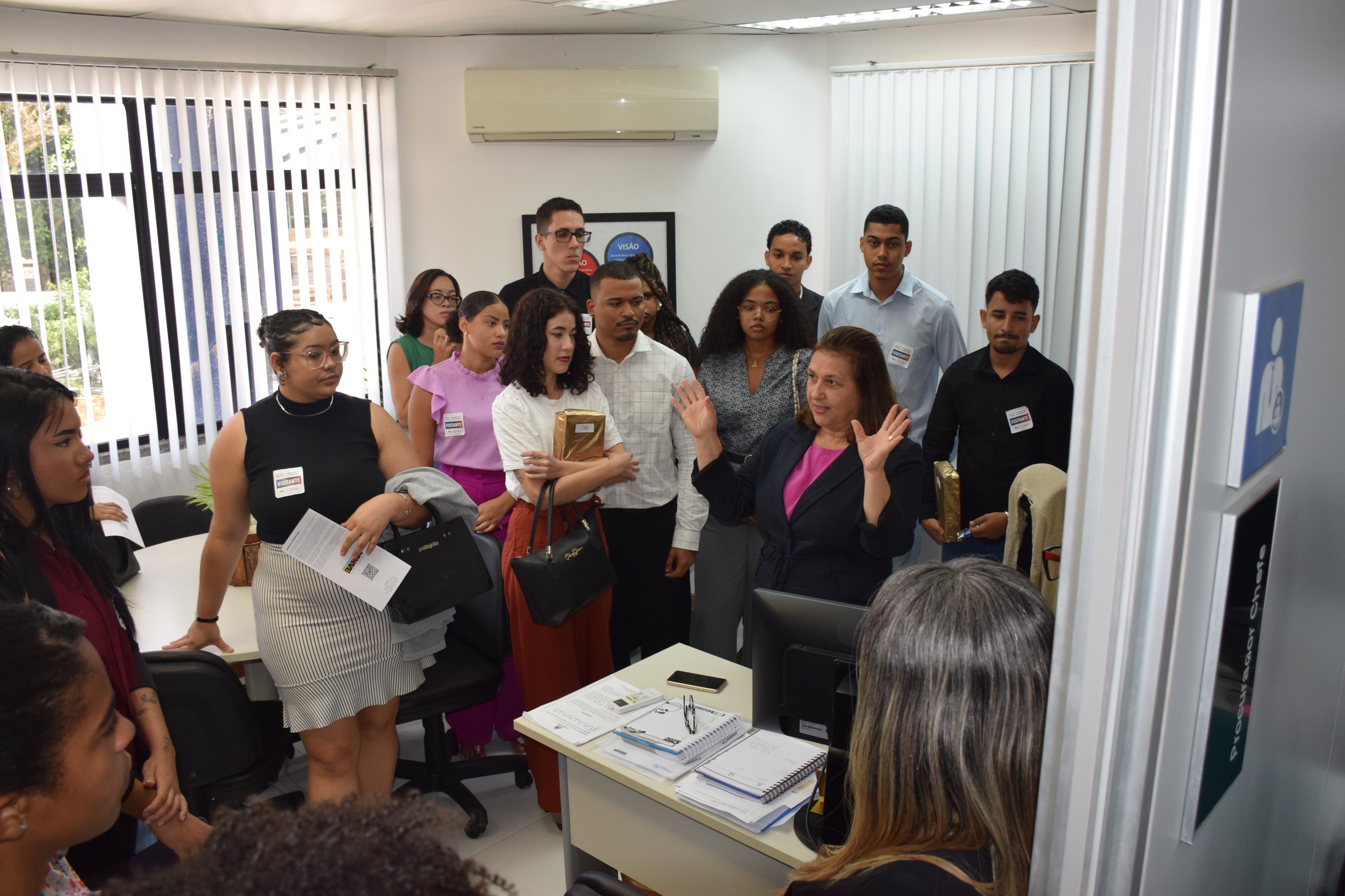 Por dentro das procuradorias especializadas - Os estudantes puderam interagir diretamente com os procuradores do Estado e conheceram de perto as diversas funções e responsabilidades desempenhadas por esses profissionais. Durante o evento, os procuradores compartilharam suas experiências, áreas de atuação e perspectivas sobre a prática do Direito no âmbito público. A atividade começou com uma apresentação rápida e dinâmica, seguida por uma visita aos diversos setores da PGE-BA. Essa imersão prática permitiu aos participantes uma compreensão mais completa das atividades desenvolvidas pelo órgão e sua relevância para a sociedade e a Administração Pública.