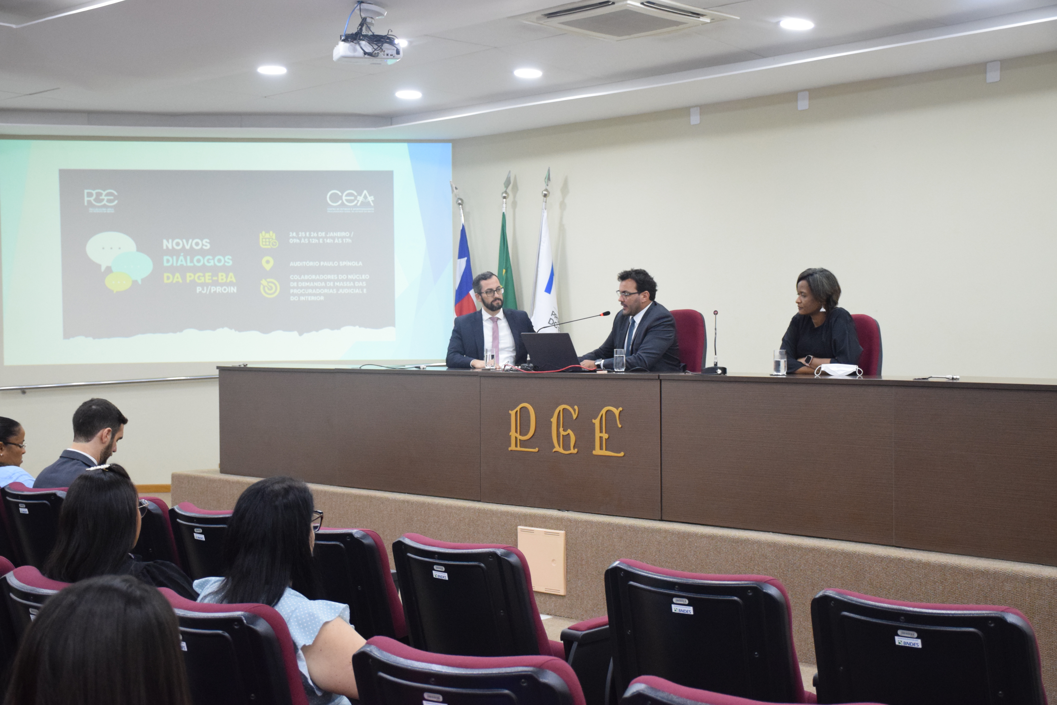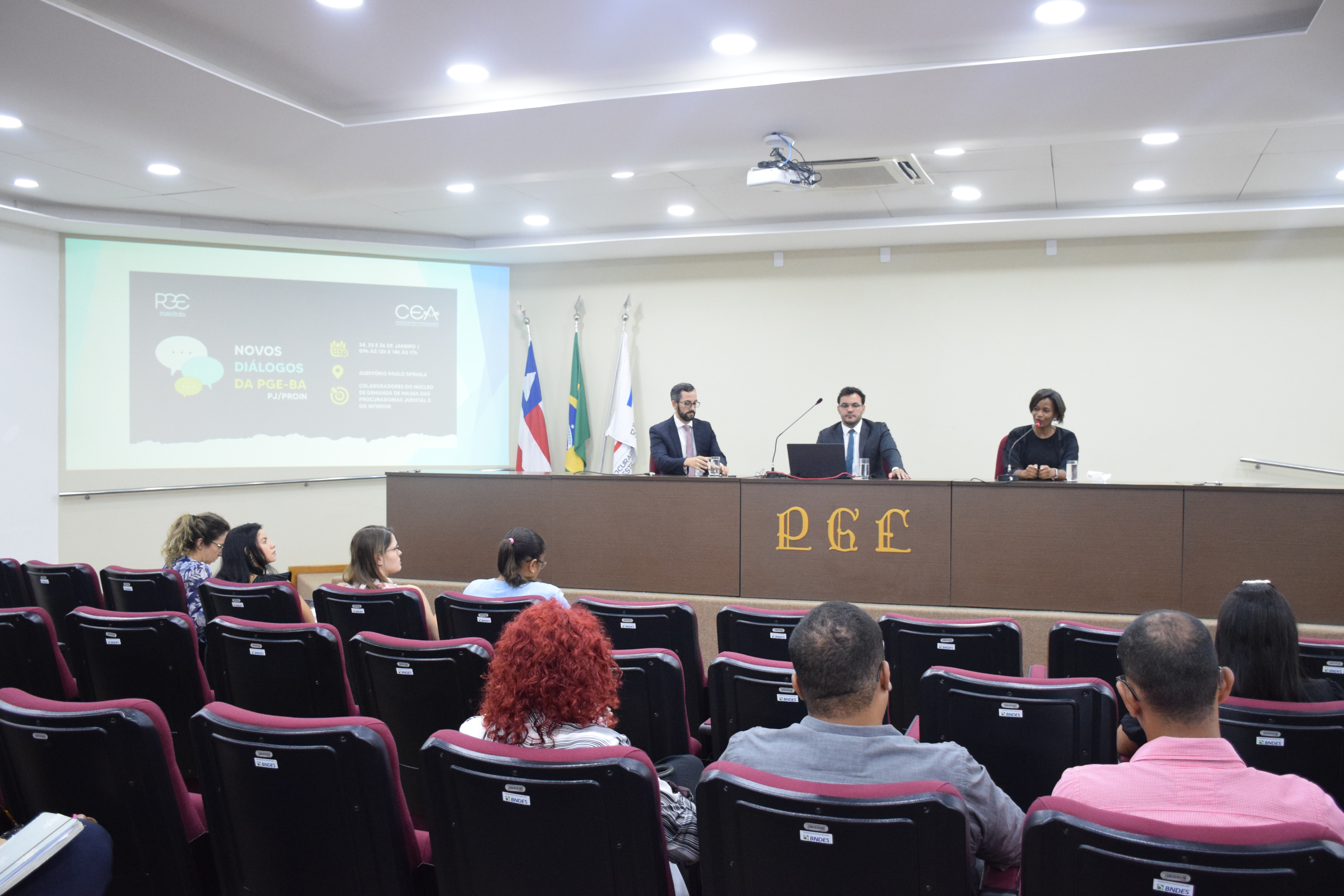 O primeiro evento do projeto Novos Diálogos, promovido pelo Centro de Estudos e Aperfeiçoamento (CEA) da Procuradoria Geral do Estado da Bahia (PGE-BA), está ocorrendo de hoje, (24), até quinta-feira, (26), no auditório da instituição, em uma parceria com as Procuradorias do Interior e Judicial. Durante esses três dias estão sendo realizados debates sobre temas relativos à atuação dos Núcleos de Demanda de Massa das duas procuradorias, alguns já absorvidos e outros cuja viabilidade de integração está em avaliação. O evento tem como coordenadores os analistas de procuradoria Fernanda Salum, André Reis e Dayana Bastos.