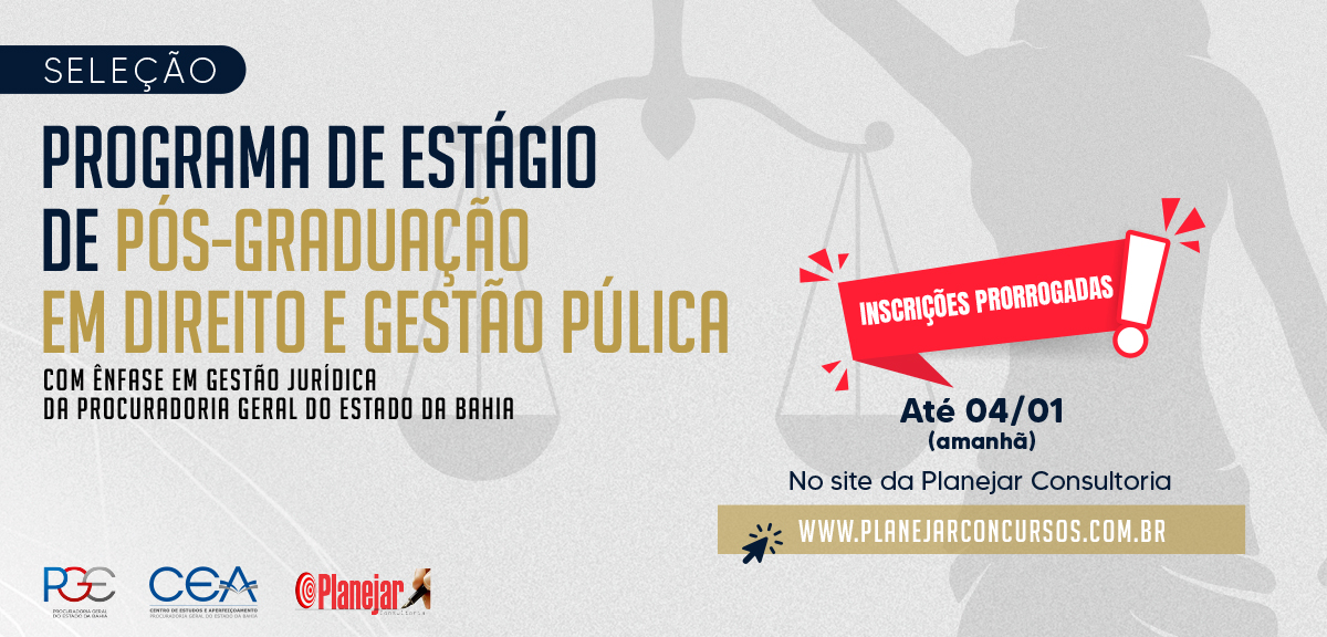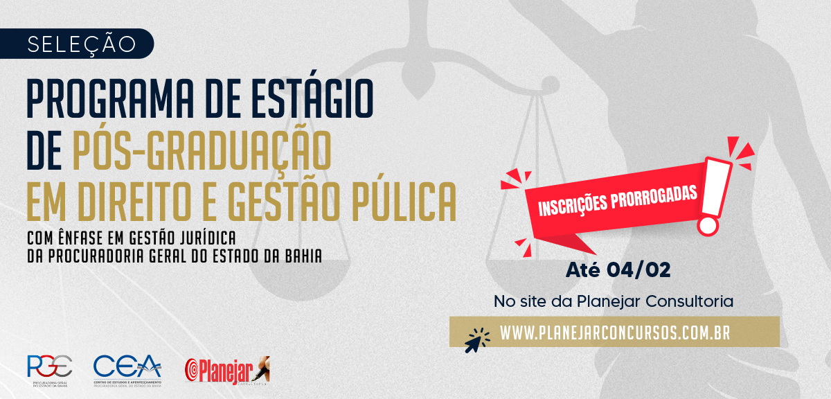 Foi prorrogado até o próximo dia 04 de janeiro de 2022 o período de inscrições da seleção para o Programa de Estágio de Nível Superior de Pós-graduação em Direito e Gestão Pública com ênfase em Gestão Jurídica da Procuradoria Geral do Estado da Bahia. As inscrições estão sendo realizadas através do site da empresa Planejar Consultoria e Planejamento- www.planejarconcursos.com.br . O novo prazo vale para inscrição e pagamento da guia.