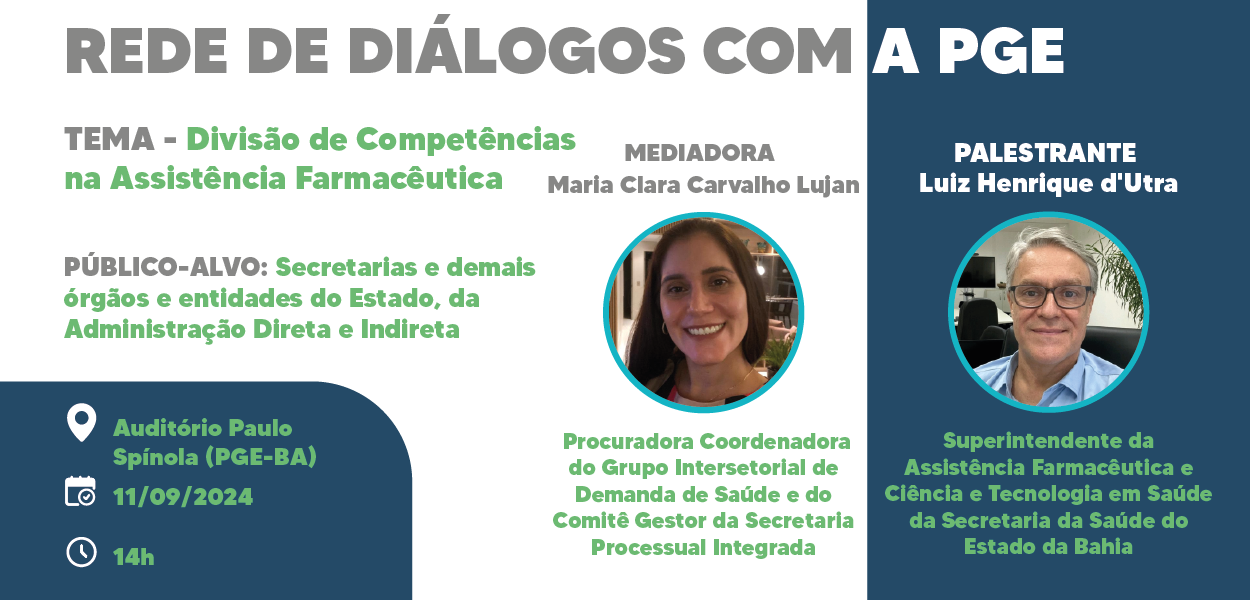 A Procuradoria Geral do Estado da Bahia (PGE-BA) promove, no próximo dia 11 de setembro, mais uma edição do projeto "Rede de Diálogos com a PGE". O encontro, que ocorrerá às 14h no auditório Paulo Spínola, abordará o tema "Divisão de Competências na Assistência Farmacêutica do SUS", reunindo especialistas e gestores para um debate essencial sobre os desafios e responsabilidades na área.