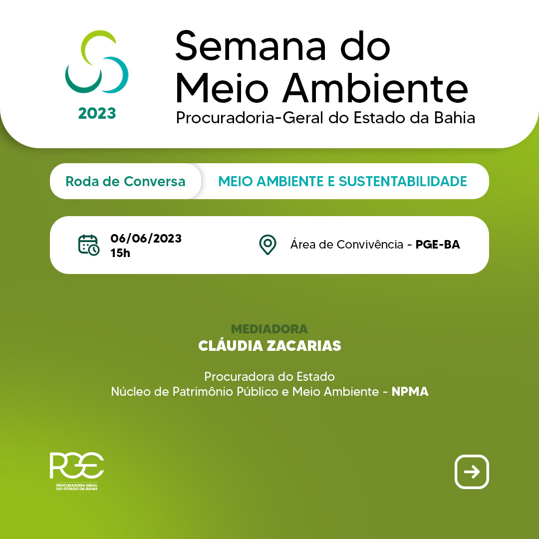 No próximo dia 06 de junho, a Procuradoria Geral do Estado da Bahia (PGE/BA) promoverá uma roda de conversa imperdível sobre meio ambiente e sustentabilidade, como parte das atividades da Semana do Meio Ambiente. O evento está marcado para às 15h, na Área de Convivência do órgão, e promete trazer insights valiosos sobre a preservação do patrimônio ambiental e o desenvolvimento sustentável.