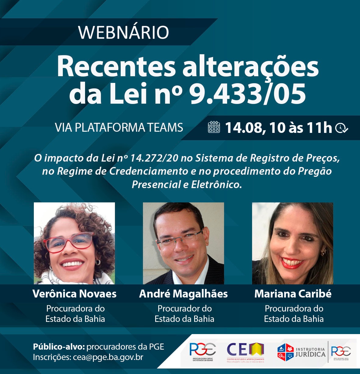 A Procuradoria Geral do Estado da Bahia realiza, na próxima sexta-feira (14), das 10 às 11h, através da plataforma TEAMS, um webinário sobre as recentes alterações da Lei nº 9.433/05. Na ocasião, serão debatidos os impactos da mudança legislativa no Sistema de Registro de Preços, no Regime de Credenciamento e no procedimento do Pregão Presencial e Eletrônico.