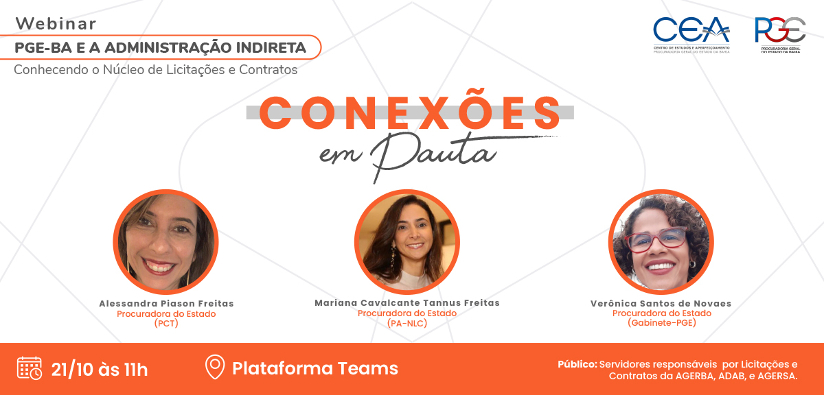 Servidores públicos que atuam nas autarquias e fundações públicas do Estado terão a oportunidade de conhecer melhor o funcionamento do Núcleo de Licitações e Contratos da Procuradoria Geral do Estado (PGE-BA), por meio do webinar “A PGE-BA e a Administração Indireta”, que ocorrerá nos dias 21 e 25/10, às 11h, para servidores responsáveis por licitações e contratos de algumas das entidades integrantes da administração indireta do Estado da Bahia.