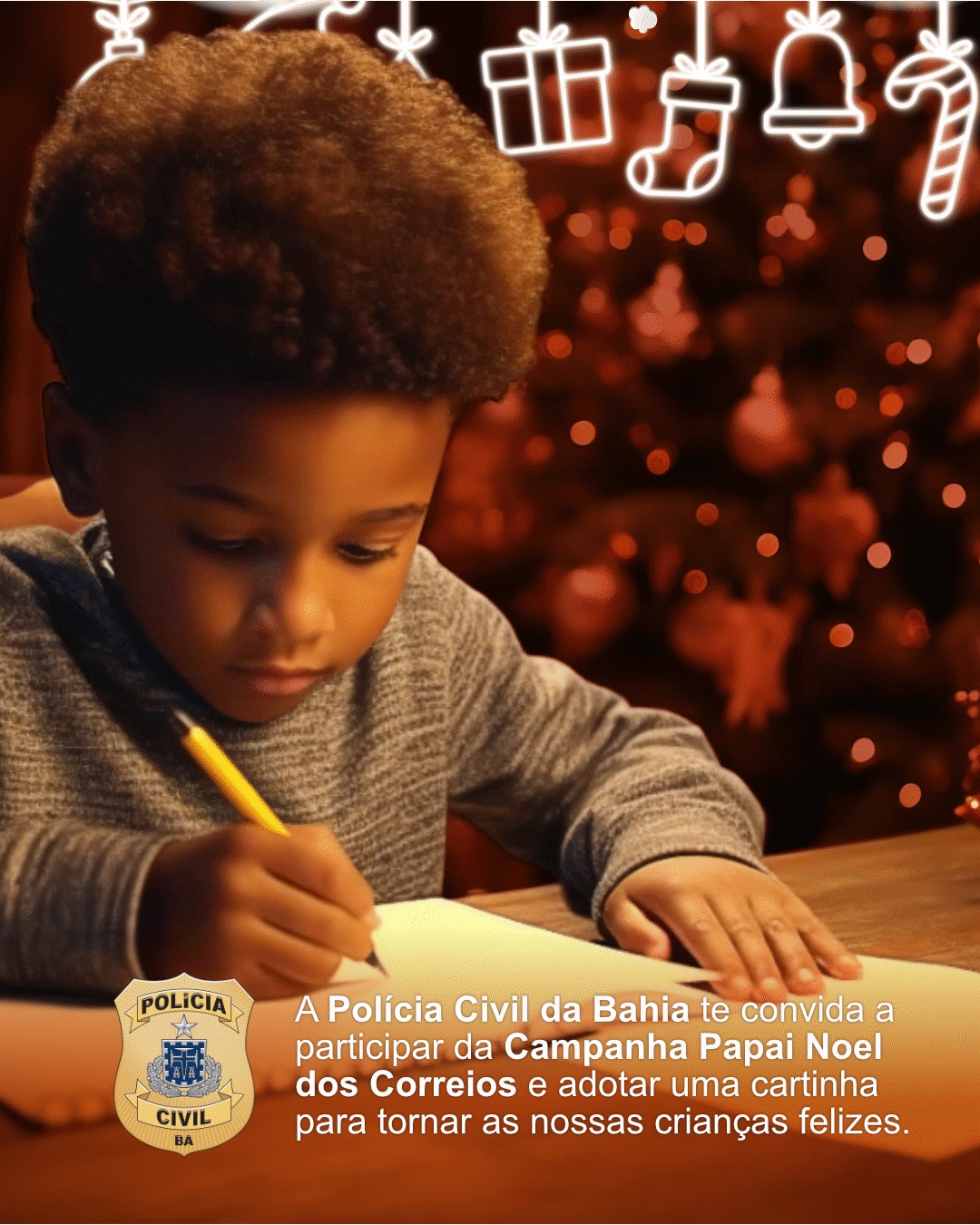 A Polícia Civil se uniu aos Correios para participar da 35ª edição da Campanha Papai Noel dos Correios, uma ação solidária que transforma sonhos em realidade. A campanha é voltada para crianças em situação de vulnerabilidade social, matriculadas em escolas públicas, desde o Ensino Infantil até o Ensino Fundamental 1.