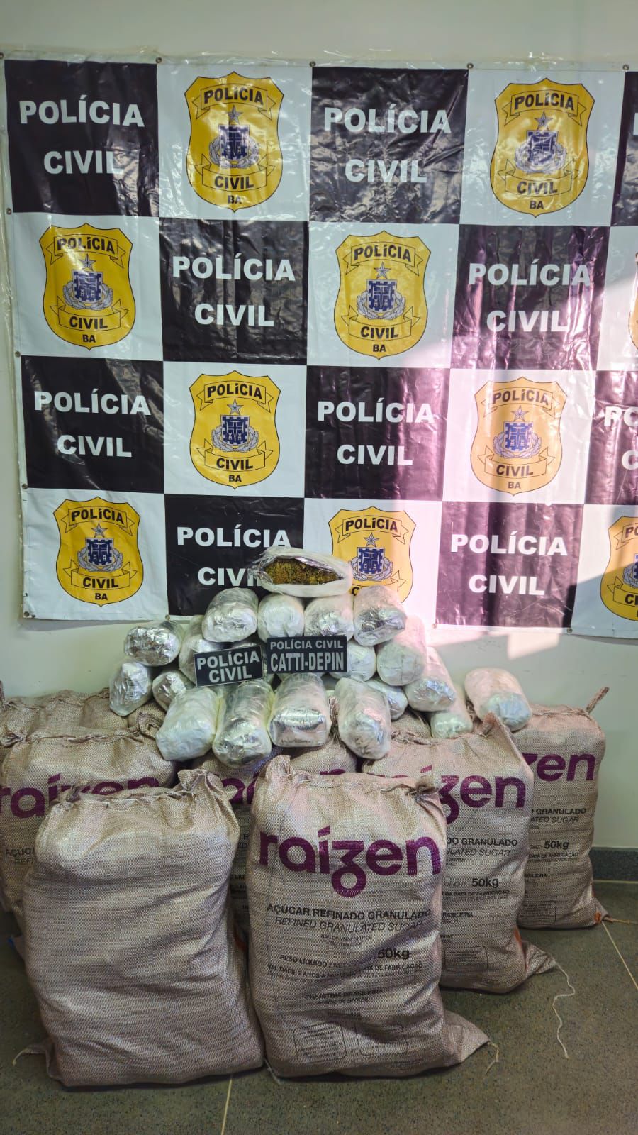 Os policiais apreenderam 174 pacotes contendo maconha do tipo skunk, com peso aproximado de 100 kg. O valor estimado da droga é de R$ 20 mil por quilo.