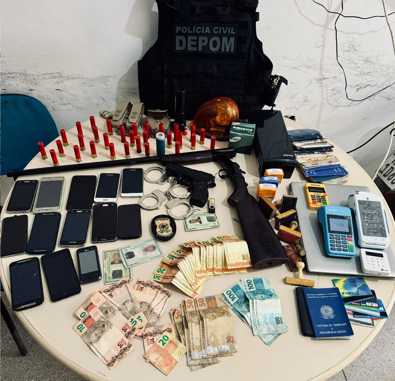 Na manhã de terça-feira (10), policiais civis da 37ª Delegacia Territorial de São Sebastião do Passé cumpriram um mandado de busca e apreensão expedido pela Vara Criminal de São Sebastião do Passé, na residência de um homem de 26 anos. Durante a operação, diversos itens foram encontrados, resultando na prisão em flagrante de outro suspeito, um homem de 53 anos. Entre os materiais apreendidos estavam uma espingarda calibre 28, munições, R$ 2.110,00 em notas falsas, carimbos de médicos, advogados e contadores, celulares e documentos de identidade falsificados com a foto do conduzido.