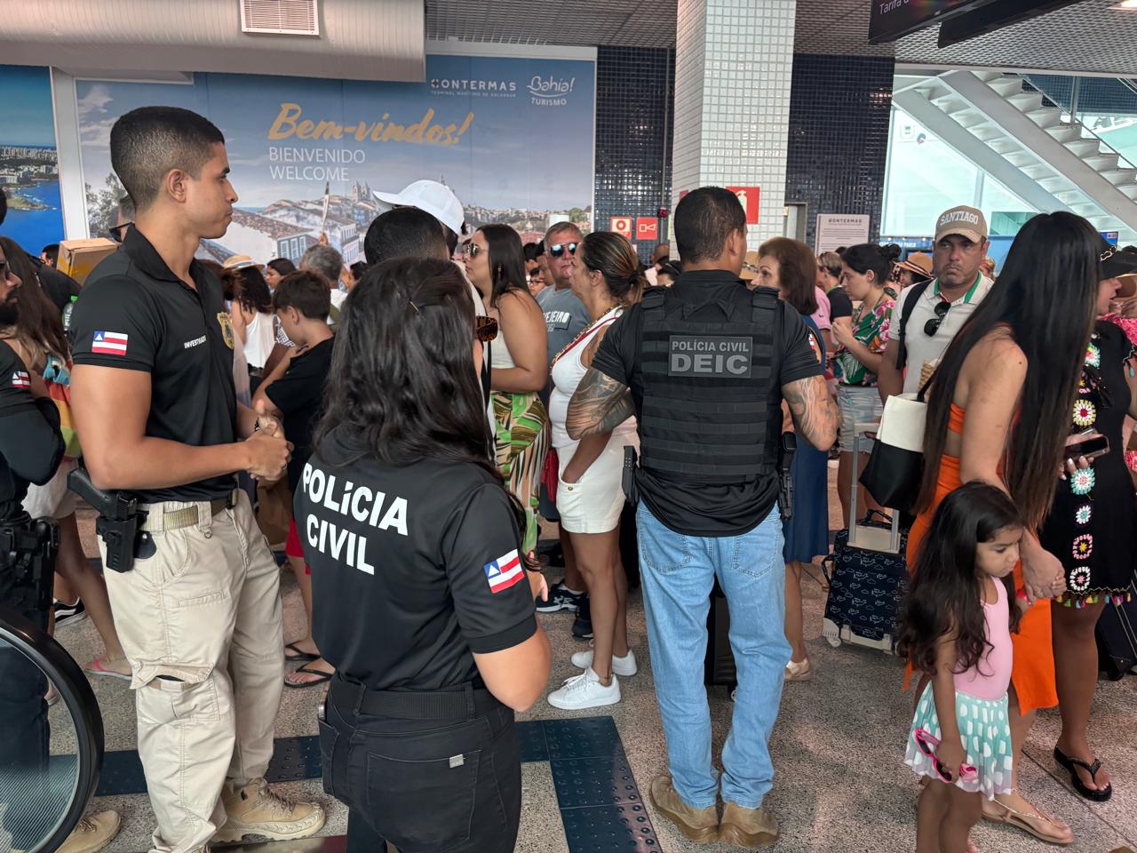 Desde o início da temporada, em novembro deste ano, 13 navios já foram recepcionados por policiais da especializada. Mais de 237 mil turistas vindos de 63 cruzeiros são aguardados na capital baiana durante todo o verão. Além do contato no desembarque, com orientações e atendimento bilíngue, as equipes também acompanham os visitantes que precisam de auxílio no deslocamento para o Aeroporto Internacional.