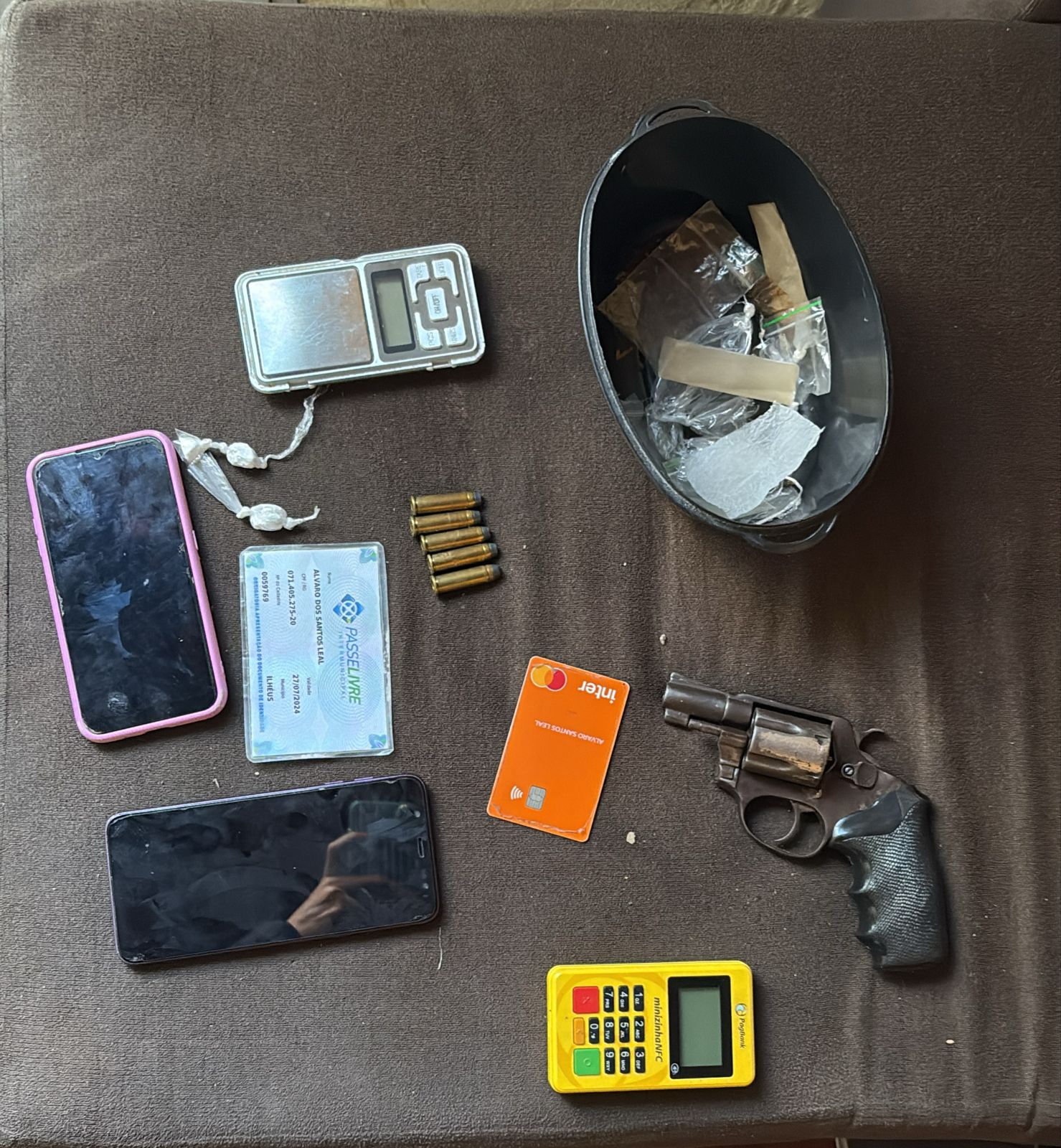 Cinco munições, uma balança, duas porções de drogas, embalagens para acondicionar entorpecentes e uma máquina de cartão de crédito também foram apreendidas com o suspeito, autuado em flagrante por posse ilegal de arma de fogo.