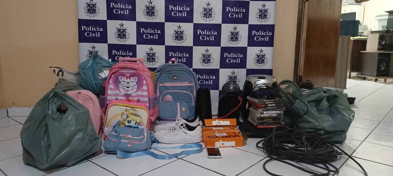 Durante a abordagem, foram recuperados diversos objetos, incluindo um iPhone, um celular, videogame, air fryer, cafeteira, roupas infantis, sapatos, material escolar e materiais de construção. Segundo a vítima, a suspeita escalou o muro da residência e entrou pela janela do banheiro.