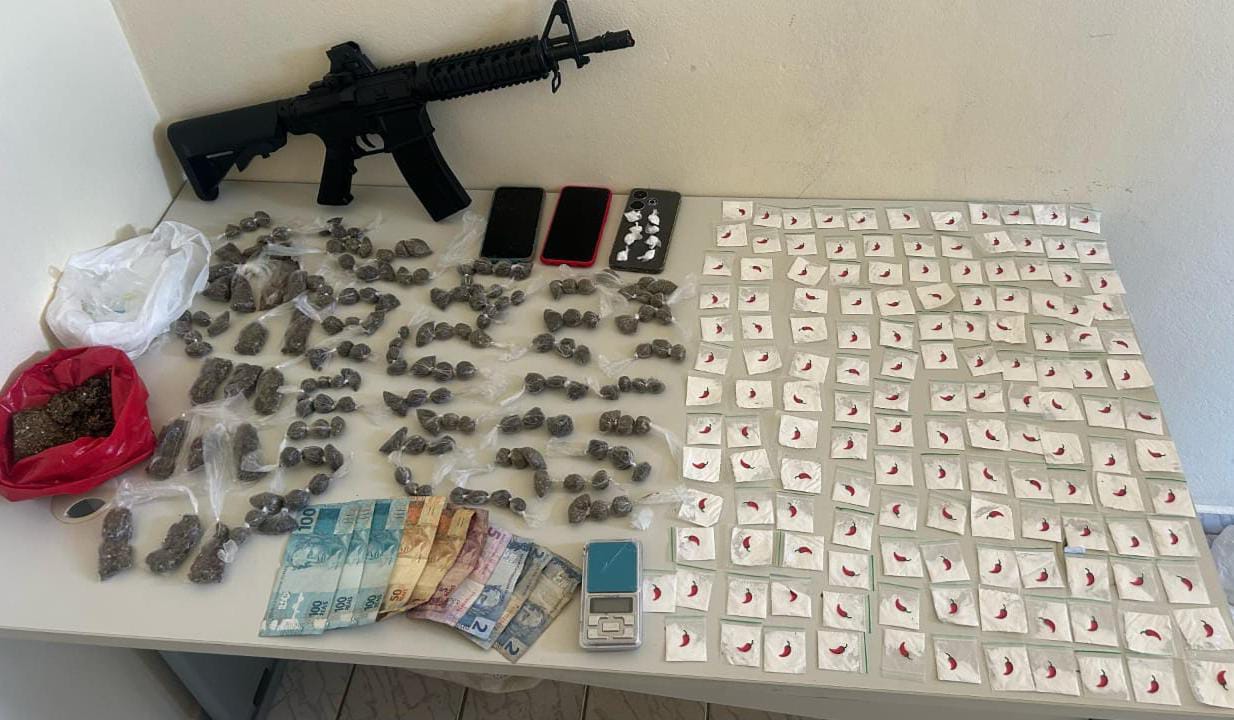 Um simulacro de fuzil, 165 porções de maconha, 153 papelotes de cocaína, munições e balanças foram apreendidos pelos investigadores durante cumprimento de mandado de busca domiciliar, que contou com o apoio de guarnições da Polícia Militar.