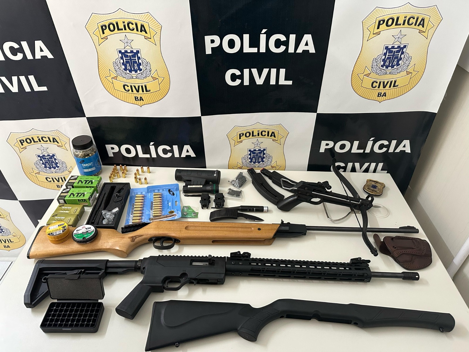 O investigado possui certificado de registro como Colecionador, Atirador Desportivo e Caçador (CAC). Durante o cumprimento da medida, acompanhado por uma testemunha, foram apreendidos um rifle semiautomático calibre .22, 120 munições calibre 9mm, 595 munições calibre .22, uma balestra, armas não letais e diversos acessórios para armamento.