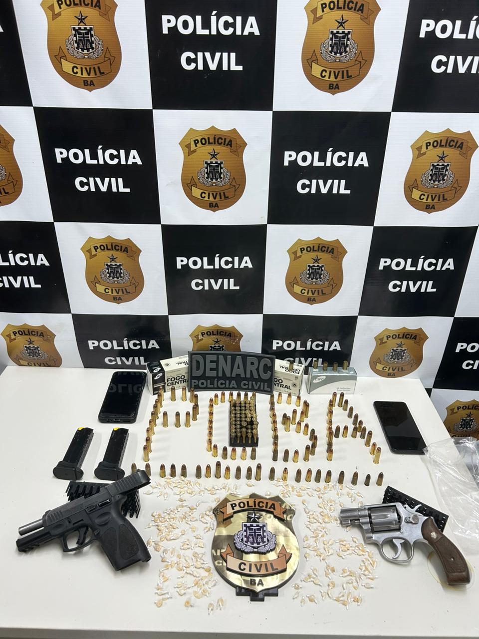 Uma pistola 9 mm, um revólver calibre 38 com numeração suprimida, munições, porções de crack e celulares foram apreendidos durante a ação, que contou com o apoio de equipes da Diretoria Regional de Polícia do Interior (Dirpin/Sudoeste), 21ª Coordenadoria Regional de Polícia do Interior (Coorpin/Itapetinga), Departamento de Repressão e Combate à Corrupção, ao Crime Organizado e à Lavagem de Dinheiro (Draco) de Conquista, Coordenação de Apoio Técnico à Investigação (CATI/Depin) e das Delegacias Territoriais de Nova Canaã, Iguaí e Ibicuí.