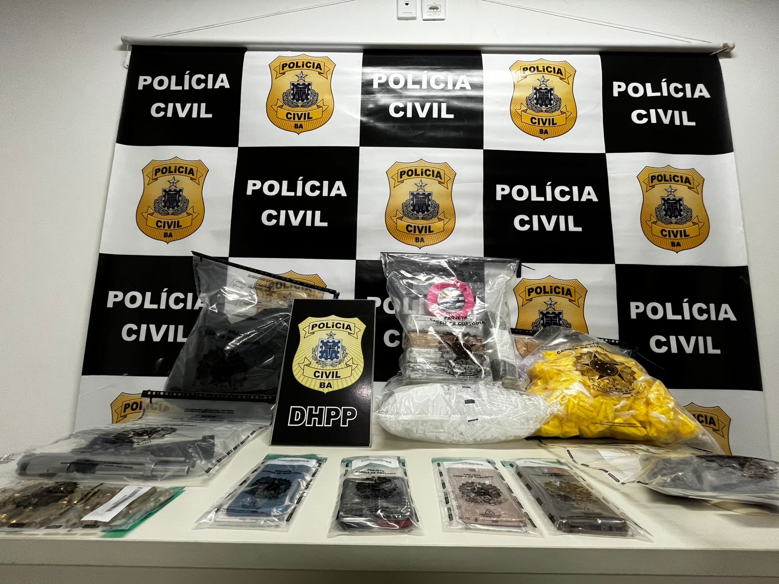 Durante o cumprimento de um dos mandados, em Salvador, foi presa em flagrante a tia de um dos alvos. Na residência, os policiais apreenderam uma pistola com carregador e munições, porções de cocaína, crack e maconha, aparelhos celulares, um colete tático com placas balísticas e uma agenda com anotações relacionadas ao tráfico de drogas.