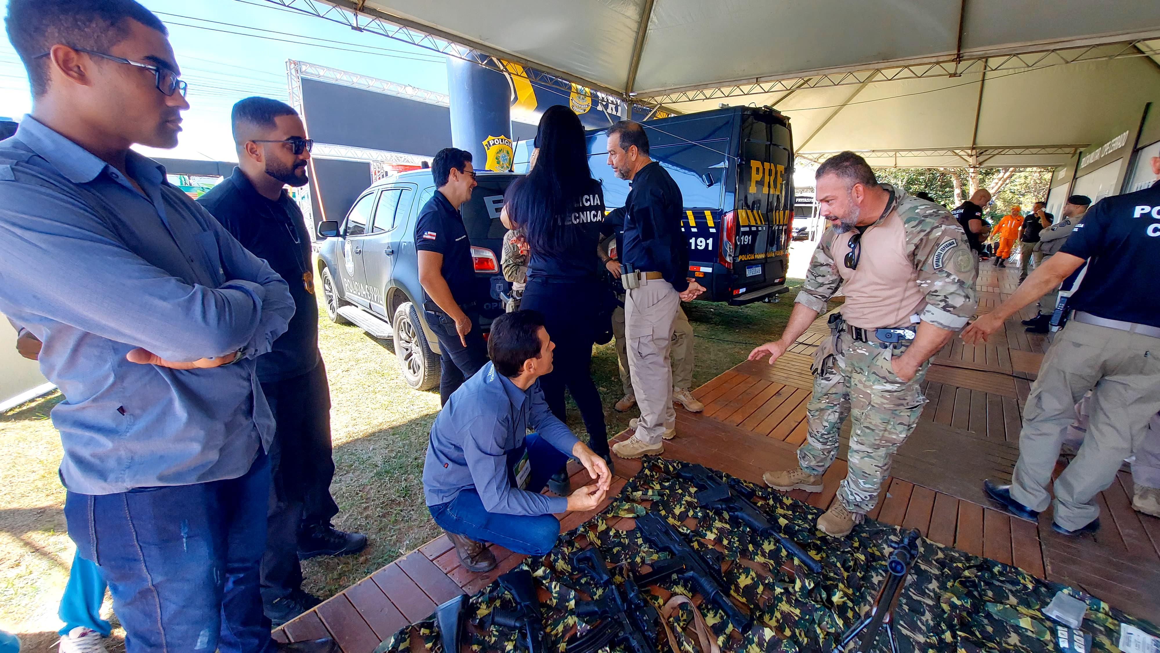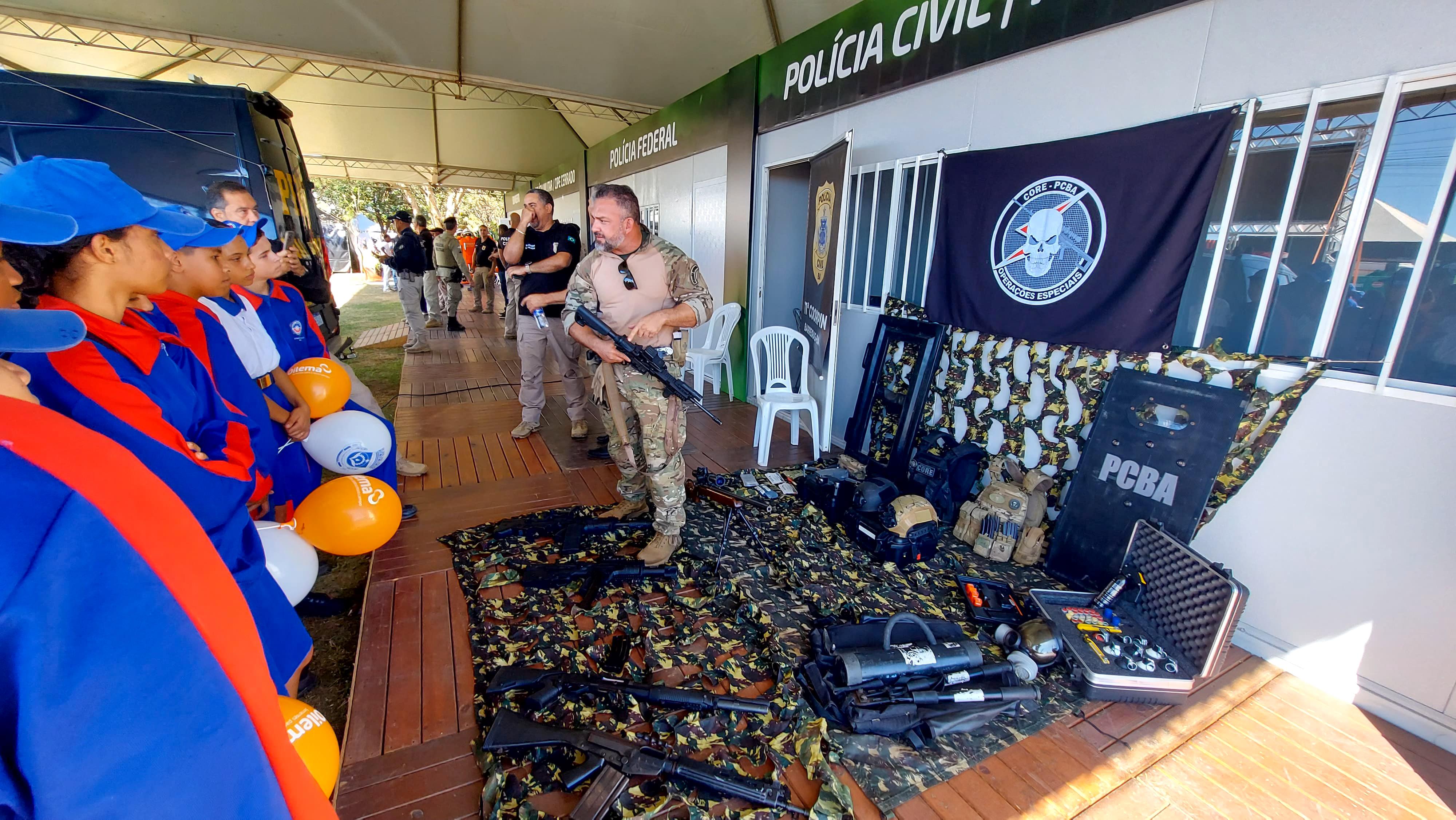 As forças de segurança estão reunidas em um estande, com demonstrações do aparato tecnológico disponível para prevenção, combate ao crime, salvamento e defesa social. Parte do efetivo da Coordenadoria Regional de Polícia do Interior (11ª Coorpin/Barreiras), com apoio da Coordenação de Operações e Recursos Especiais (CORE), expõe materiais bélicos letais (armamento) e não letais, como gás de pimenta e granadas de efeito moral, luz e som.
