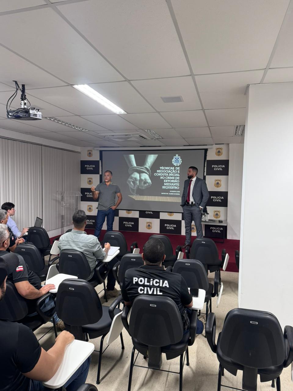 A aula de hoje foi ministrada pelo investigador Kleber Moreira Miranda, especialista em gerenciamento de crises e técnicas de negociação. O principal objetivo da ação é qualificar os servidores no manejo de situações relacionadas ao crime de sequestro. A iniciativa também fortalece o preparo técnico-operacional da PCBA no enfrentamento de ocorrências de alta complexidade.