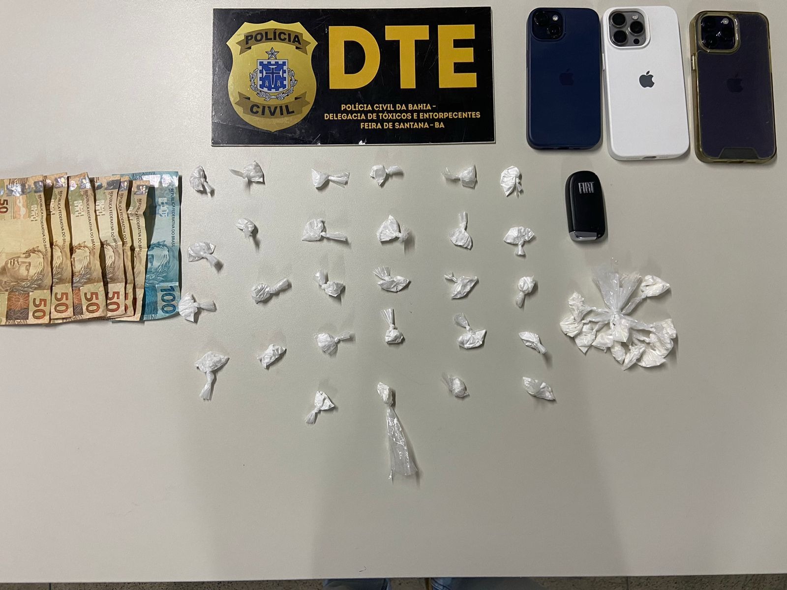 Um homem foi preso em flagrante por tráfico de drogas, nesta quarta-feira (11), em Feira de Santana, durante ação da Delegacia de Tóxicos e Entorpecentes (9ª DTE). As investigações indicam que ele realizava a venda de cocaína na modalidade “delivery”, com entregas feitas diretamente aos usuários.