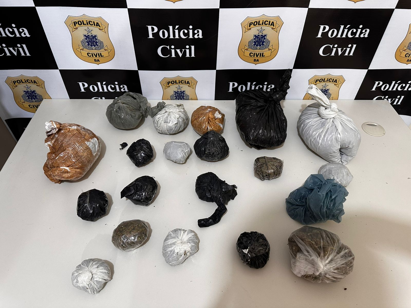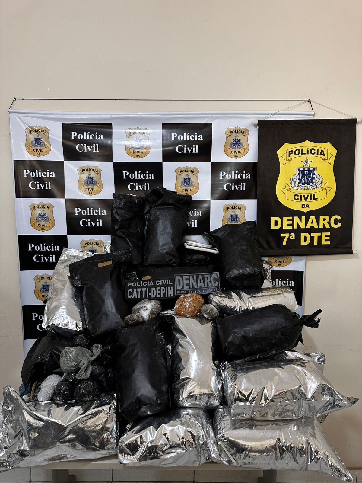 A Polícia Civil da Bahia prendeu um homem de 38 anos em flagrante com 38 quilos de maconha, divididos em 36 sacos e 20 porções, durante o cumprimento de mandado de busca e apreensão no bairro Jardim Flórida, em Juazeiro, nesta quinta-feira (3). As investigações identificaram um imóvel utilizado para armazenar entorpecentes na região. As drogas estavam distribuídas pelos cômodos do local e parte escondida no forro, no espaço de encaixe da luminária.