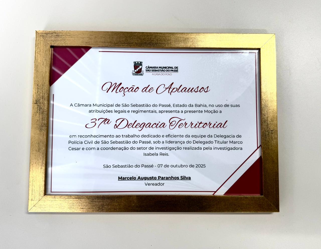 A 37ª Delegacia Territorial (DT/São Sebastião do Passé) recebeu, nesta terça-feira (14), uma Moção de Aplausos concedida pela Câmara Municipal, em reconhecimento ao trabalho dedicado e eficiente desenvolvido pela unidade no enfrentamento à criminalidade e na elucidação de crimes no município.