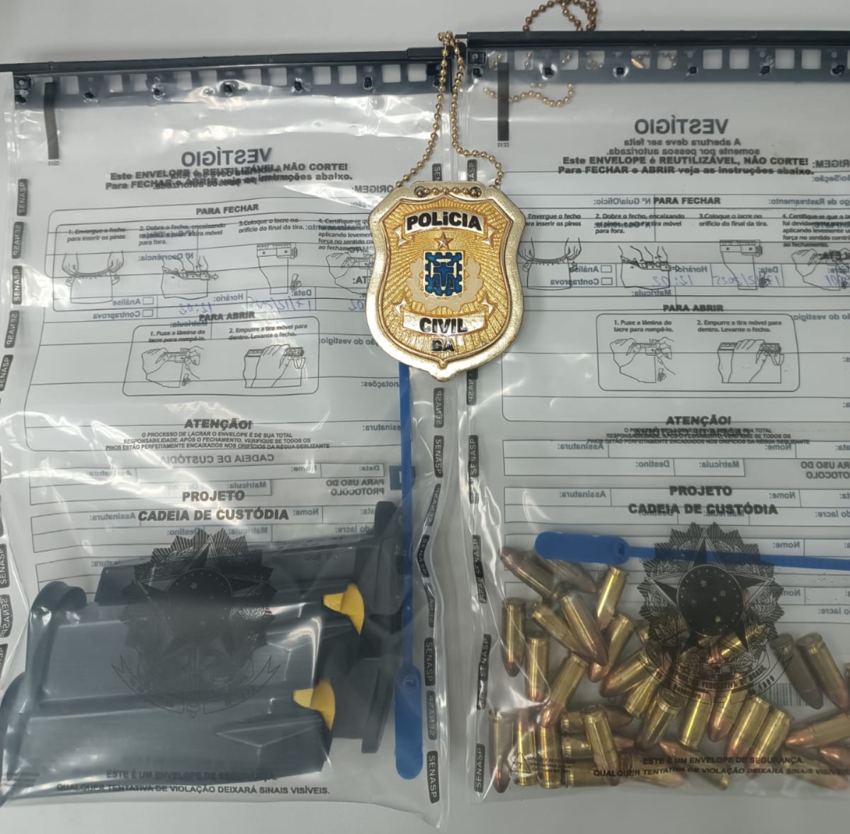 Durante a diligência, as equipes localizaram o homem, que possui registro de Colecionador, Atirador Desportivo e Caçador (CAC). Após a ciência da decisão judicial, o autor permitiu a entrada no imóvel e indicou o compartimento onde os itens estavam armazenados. No interior de um cofre, os agentes encontraram duas pistolas calibre 9mm e quatro carregadores, além de 37 munições, material que foi recolhido e encaminhado para custódia.