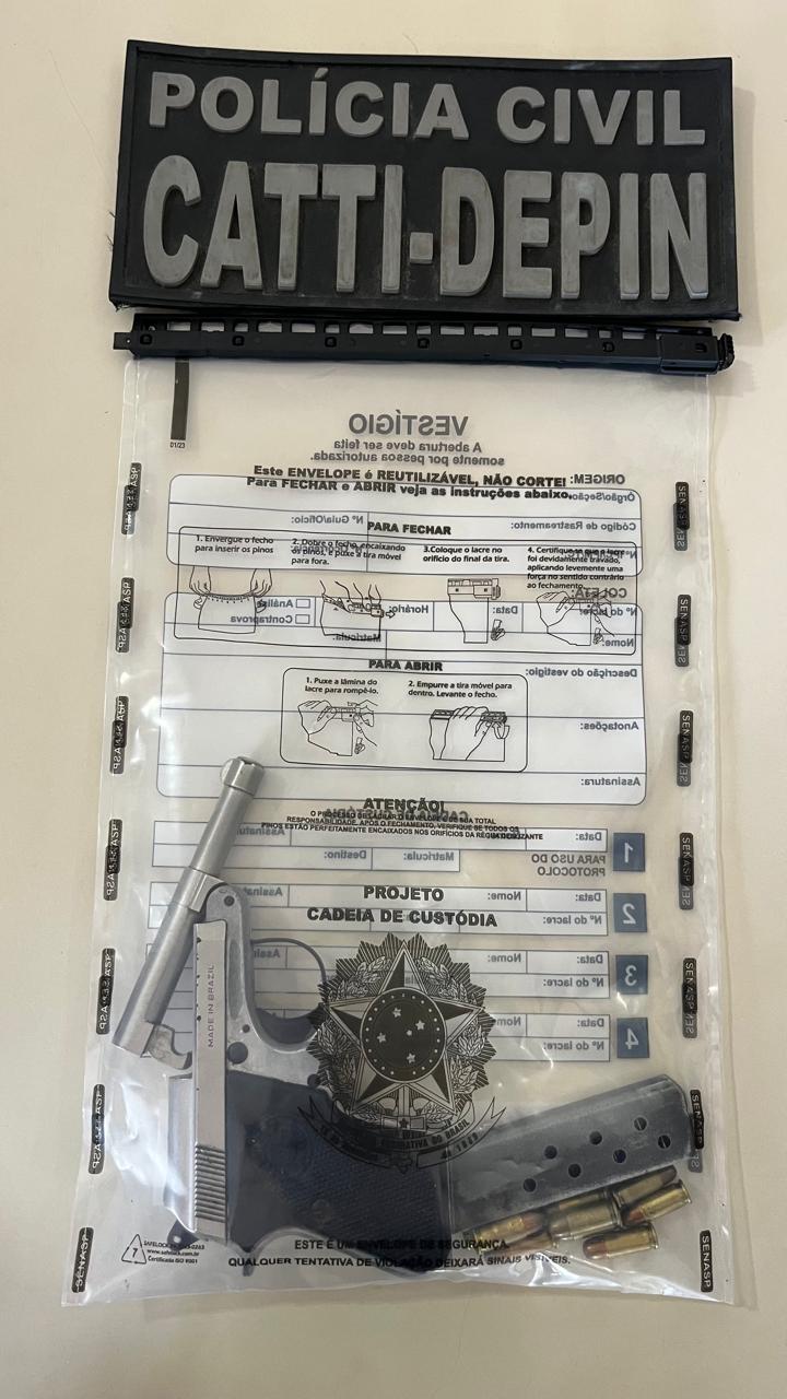Durante a diligência, os policiais localizaram no quarto do suspeito uma pistola calibre 6.35 com numeração suprimida, municiada com 10 cartuchos intactos. Também foram apreendidos um canivete e um aparelho celular.