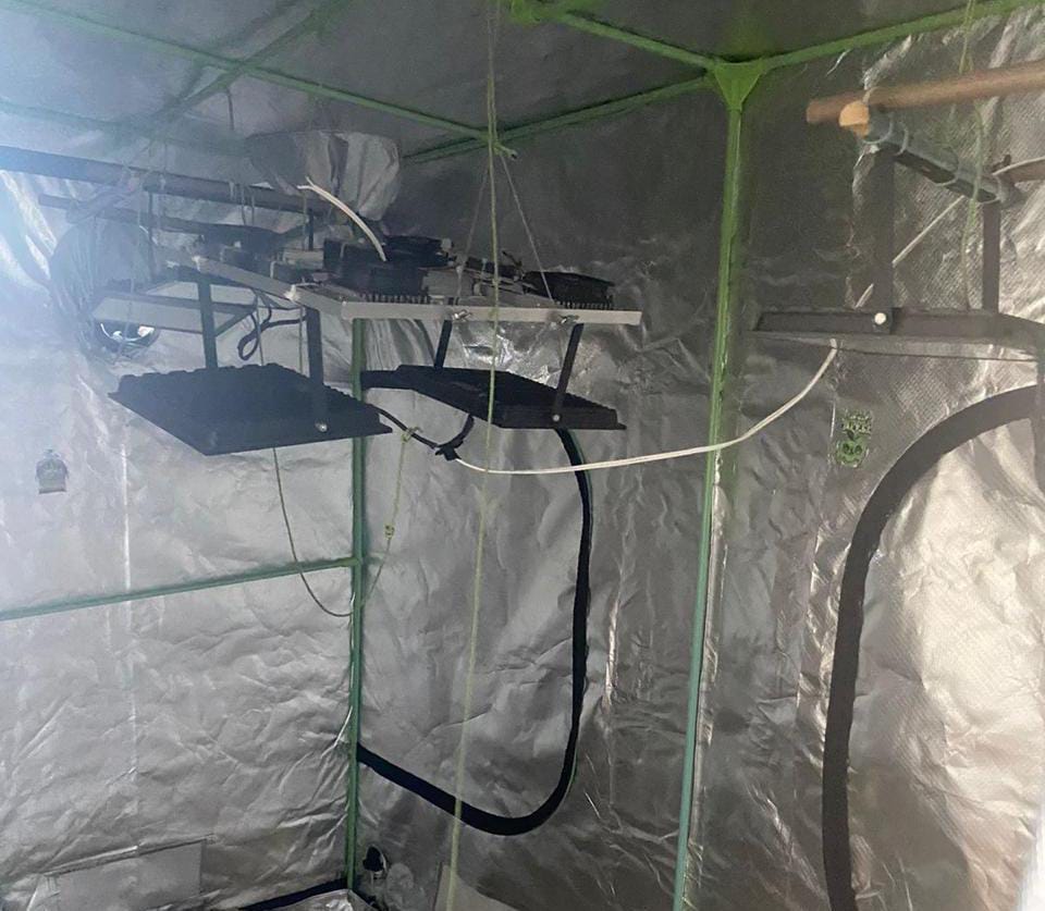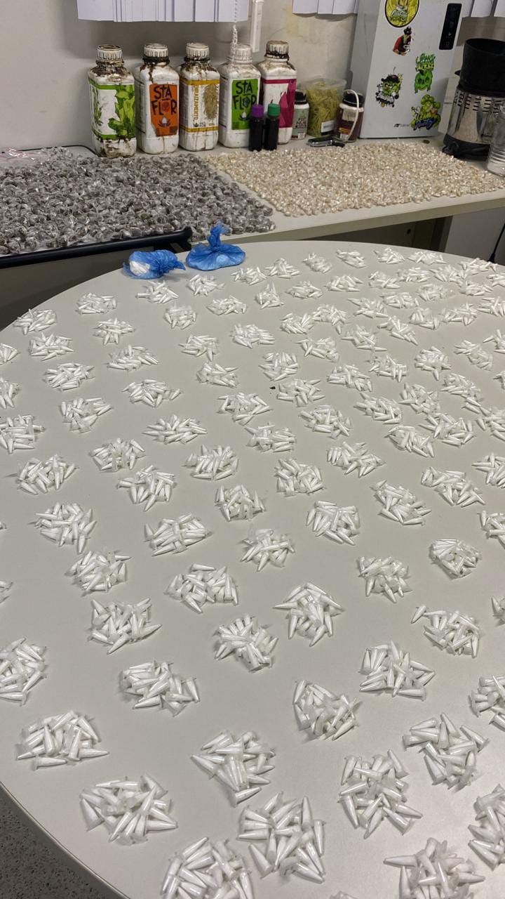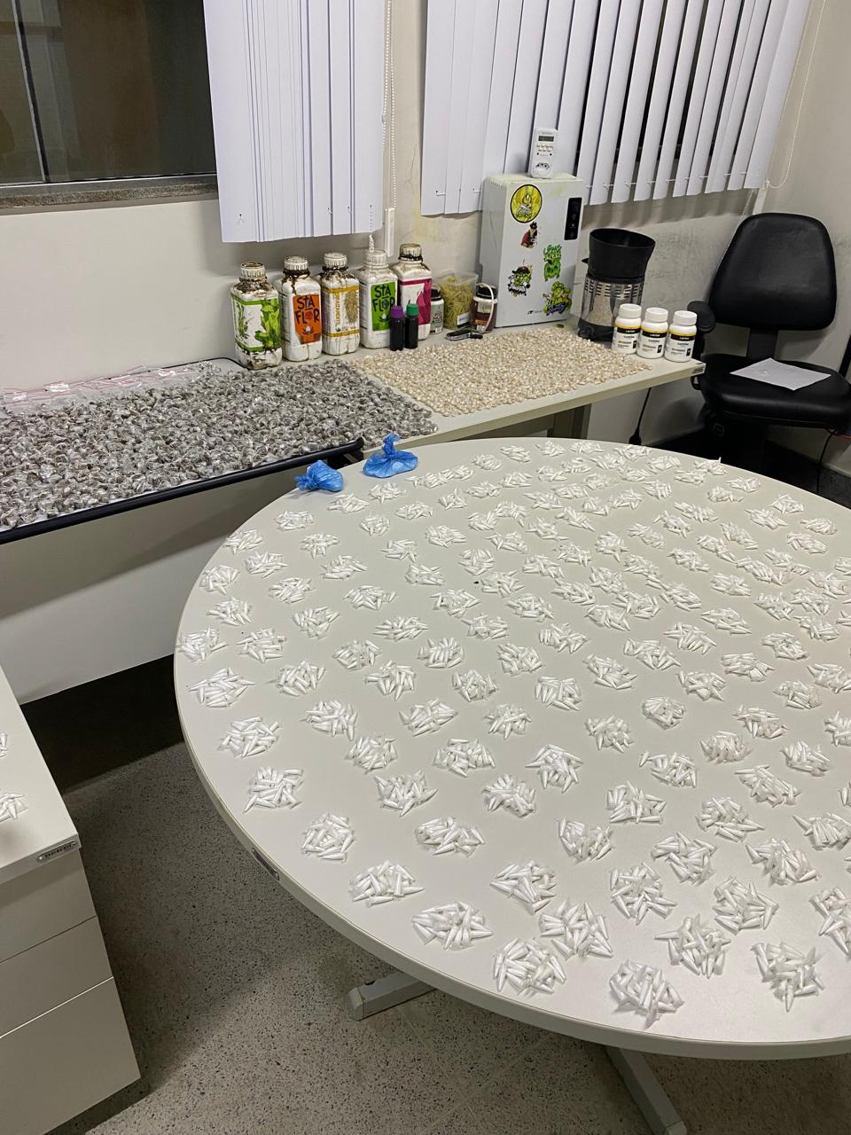 No imóvel, os policiais encontraram uma estrutura organizada para preparo e distribuição de drogas, incluindo estufa climatizada destinada ao cultivo de maconha. Foram apreendidos uma pistola calibre 9mm, dois carregadores municiados, 3.030 pinos e três porções médias de cocaína, 1.193 pedras de crack, 2.968 buchas de maconha, 42 buchas de skunk, 250 gramas de haxixe e pés de maconha em cultivo.