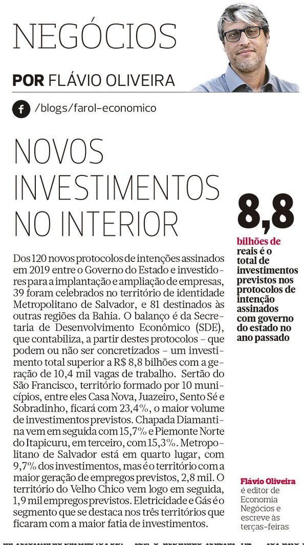 Dos 120 novos protocolos de intenções assinados em 2019 entre o Governo do Estado e investidores para a implantação e ampliação de empresas, 39 foram celebrados no território de identidade Metropolitano de Salvador, e 81 destinados às outras regiões da Bahia. O balanço é da Secretaria de Desenvolvimento Econômico (SDE)