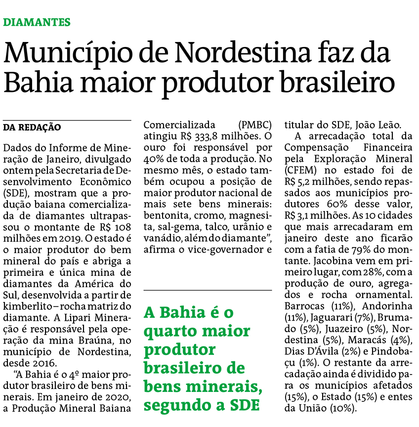Produção baiana de diamantes ultrapassou R$ 108 milhões em 2019