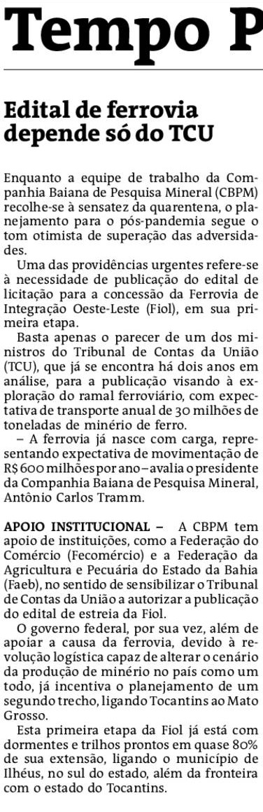 Enquanto a equipe de trabalho da Companhia Baiana de Pesquisa Mineral (CBPM) recolhe-se à sensatez da quarentena, o planejamento para o pós-pandemia segue o tom otimista de superação das adversidades. Uma das providências urgentes refere-se à necessidade de publicação do edital de licitação para a concessão da Ferrovia de Integração Oeste-Leste (Fiol), em sua primeira etapa.