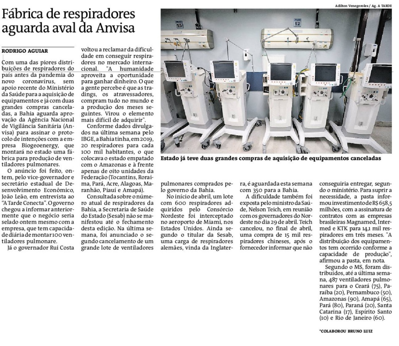 Com uma das piores distribuições de respiradores do país antes da pandemia do novo coronavírus, sem apoio recente do Ministério da Saúde para a aquisição de equipamentos e já com duas grandes compras canceladas, a Bahia aguarda aprovação da Agência Nacional de Vigilância Sanitária (Anvisa) para assinar o protocolo de intenções com a empresa Biogeoenergy, que montará no estado uma fábrica para produção de ventiladores pulmonares.