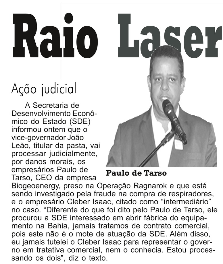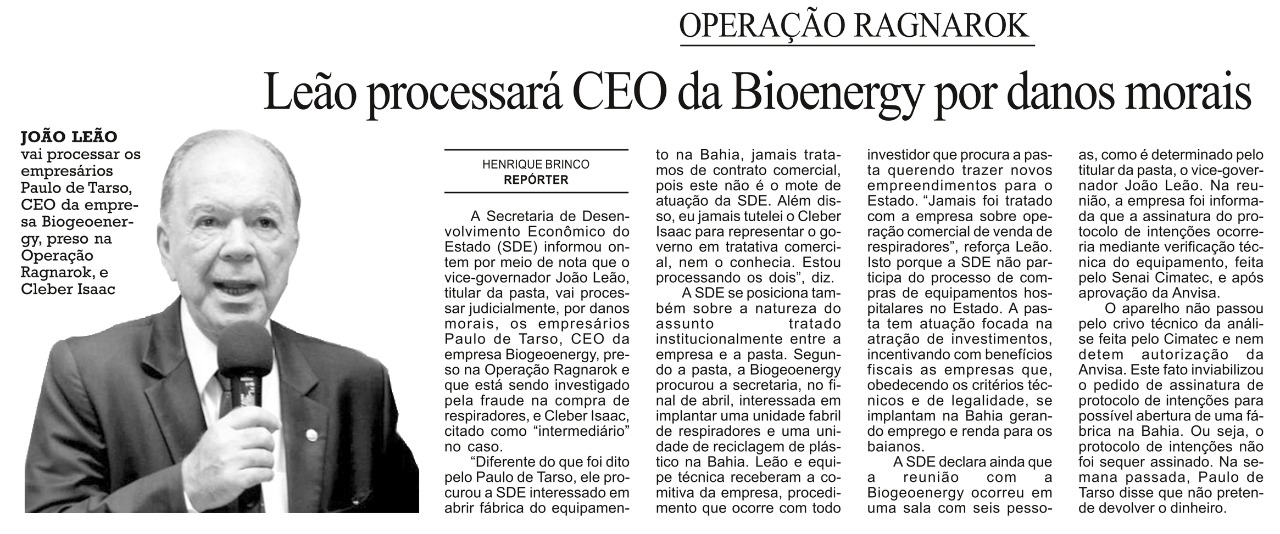 A Secretaria de Desenvolvimento Econômico do Estado (SDE) informou nesta segunda-feira (15) que o vice-governador João Leão, titular da pasta, vai processar judicialmente, por danos morais, os empresários Paulo de Tarso, CEO da empresa Biogeoenergy, preso na Operação Ragnarok e que está sendo investigado pela fraude na compra de respiradores, e o empresário Cleber Isaac, citado como “intermediário” no caso.