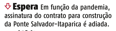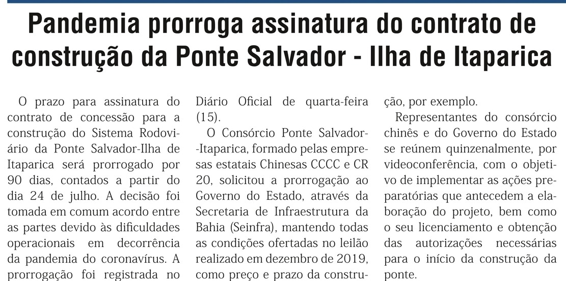 O prazo para assinatura do contrato de concessão para a construção do Sistema Rodoviário Ponte Salvador-Ilha de Itaparica será prorrogado por 90 dias, contados a partir do dia ‪24 de julho‬. A decisão foi tomada em comum acordo entre as partes devido às dificuldades operacionais em decorrência da pandemia do coronavírus. A prorrogação foi registrada no Diário Oficial desta quarta-feira (15).
