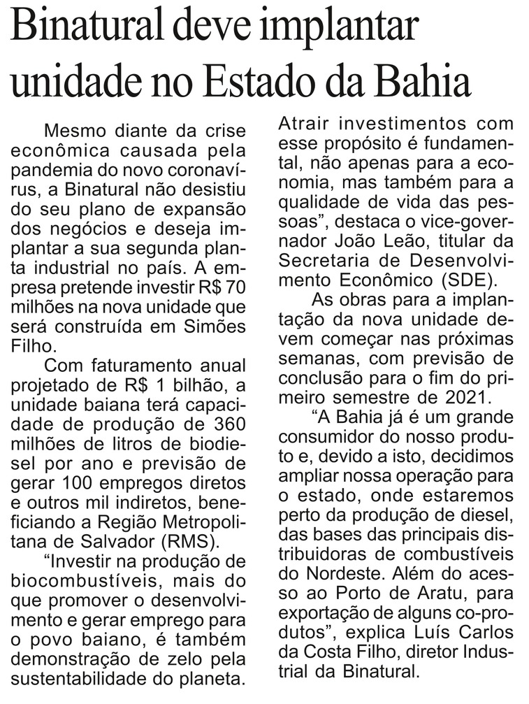 Binatural deve implantar unidade no Estado da Bahia