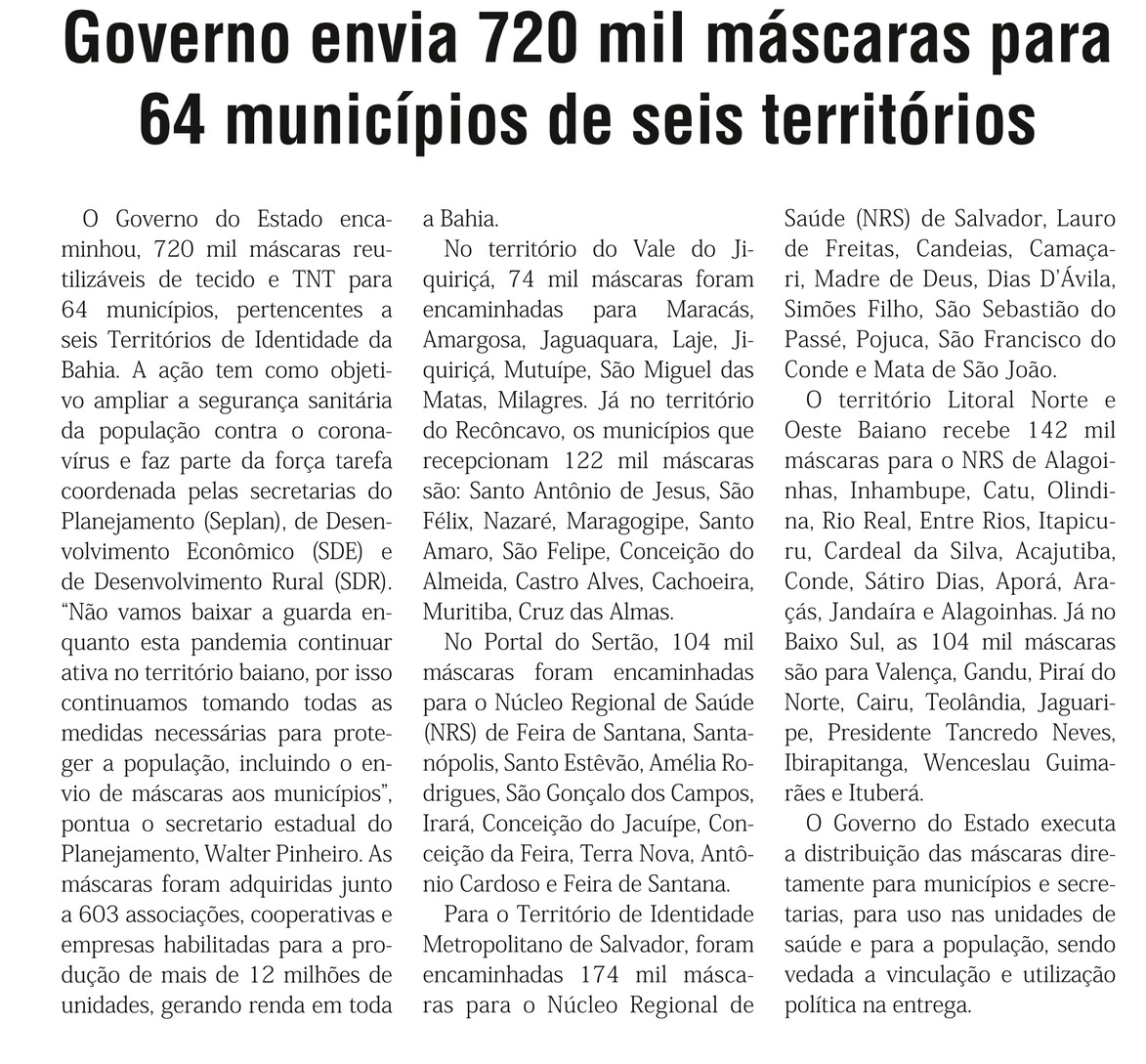 Governo envia 720 mil máscaras para 64 municípios de seis territórios
