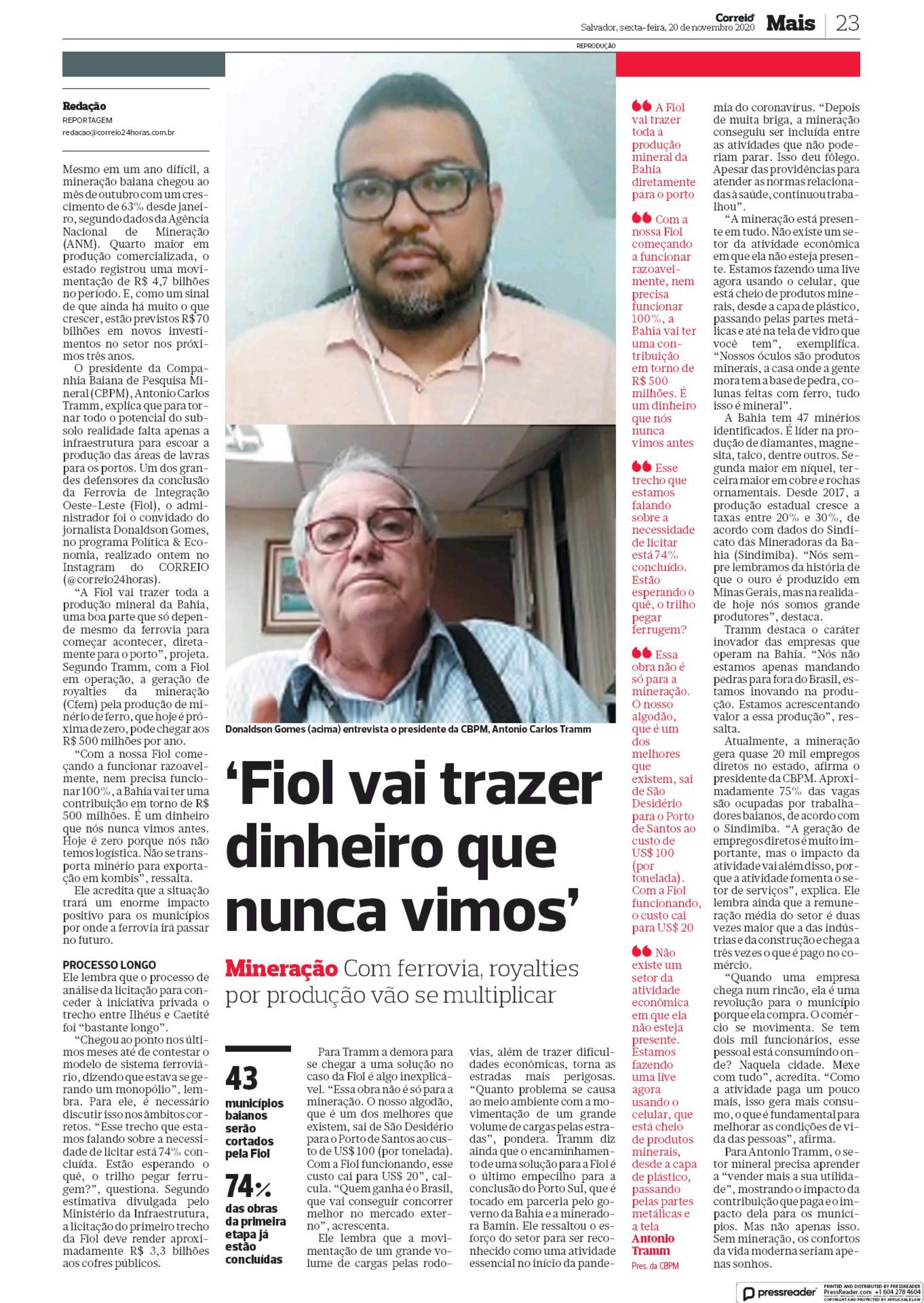 Correio da Bahia - 'Fiol vai trazer dinheiro que nunca vimos'