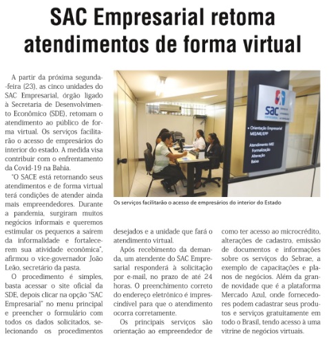 Jornal Folha do Estado da Bahia- SAC Empresarial retoma atendimentos de forma virtual