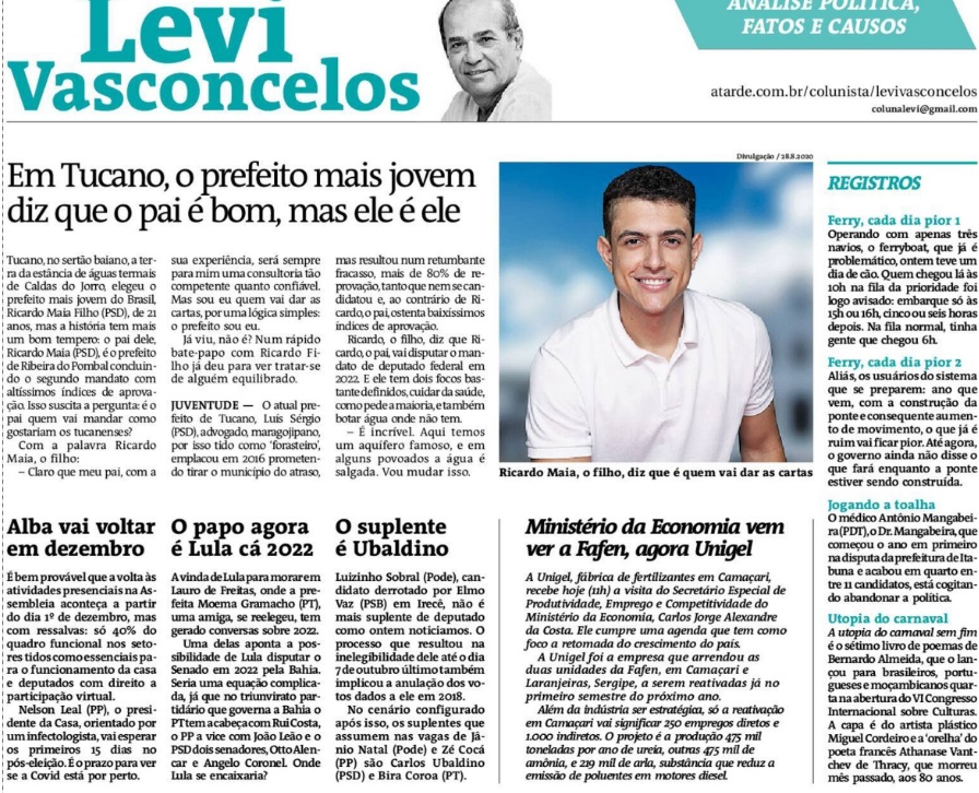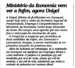 A Tarde - Ministério da economia vem ver a Fafen, agora a Unigel