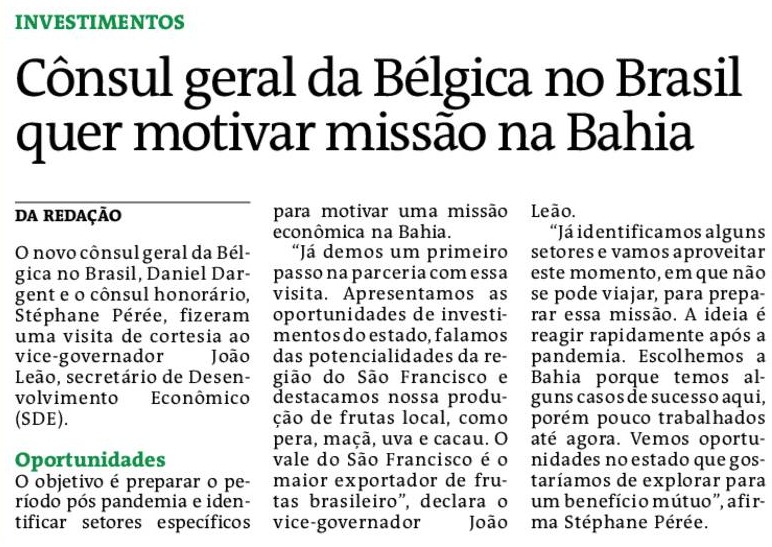 O novo cônsul geral da Bélgica no Brasil, Daniel Dargent e o cônsul honorário, Stéphane Pérée, fizeram uma visita de cortesia ao vice-governador João Leão, secretário de Desenvolvimento Econômico (SDE), na última quinta-feira (26). O objetivo é preparar o período pós pandemia e identificar setores específicos para motivar uma missão econômica na Bahia.