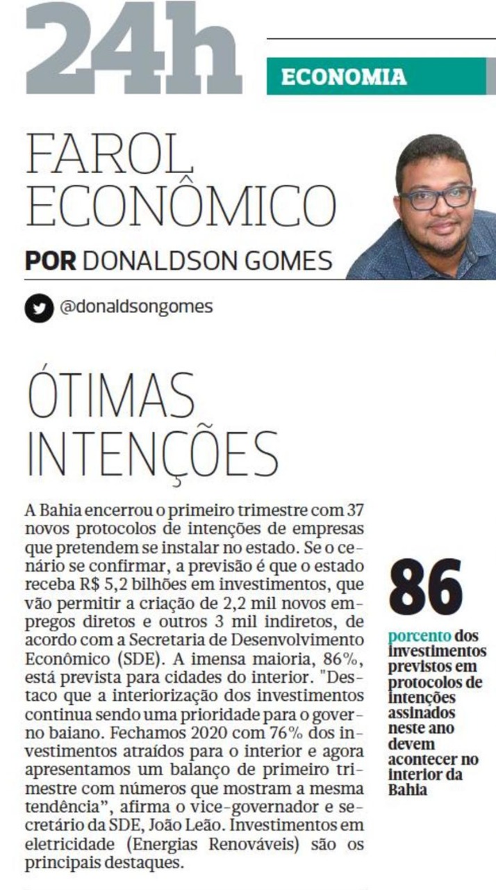 A Bahia encerrou o primeiro trimestre com 37 novos protocolos de intenções de empresas que pretendem se instalar no estado. Se o cenário se confirmar, a previsão é que o estado receba R$ 5,2 bilhões em investimentos, que vão permitir a criação de 2,2 mil novos empregos diretos e outros 3 mil indiretos, de acordo com a Secretaria de Desenvolvimento Econômico (SDE).