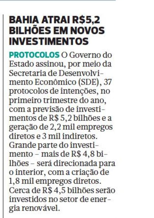 No primeiro trimestre de 2021, o Governo do Estado assinou, por meio da Secretaria de Desenvolvimento Econômico (SDE), 37 protocolos de intenções, com previsão de investimentos de R$ 5,2 bilhões e a geração de 2,2 mil empregos diretos e 3 mil indiretos. 86% deles tem previsão de se instalar no interior do Estado, onde a grande parte do investimento será aplicado, mais de R$ 4,8 bilhões, criando 1,8 mil empregos diretos.