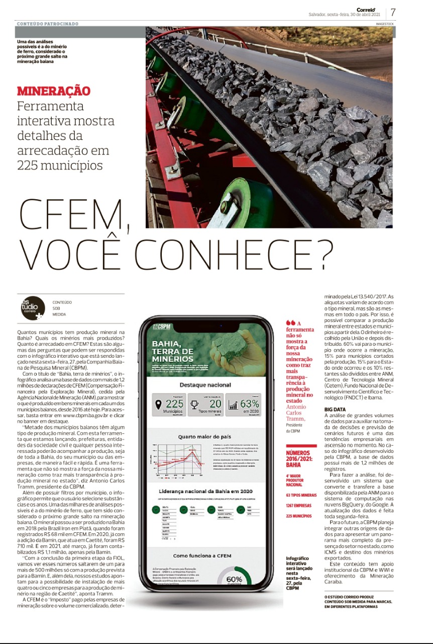 Quantos municípios tem produção mineral na Bahia? Quais os minérios mais produzidos? Quanto é arrecadado em CFEM? Estas são algumas das perguntas que podem ser respondidas com o infográfico interativo que está sendo lançado nesta sexta-feira, 27, pela Companhia Baiana de Pesquisa Mineral (CBPM).