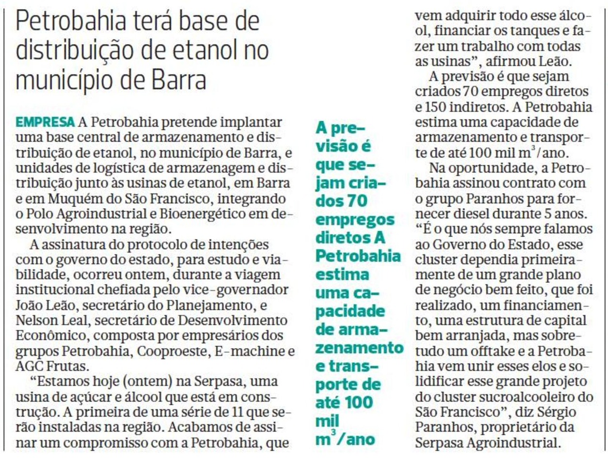 A Petrobahia pretende implantar uma base central de armazenamento e distribuição de etanol, no município de Barra, e unidades de logística de armazenagem e distribuição junto às usinas de etanol, em Barra e no Muquém do São Francisco, integrando o Polo Agroindustrial e Bioenergético em desenvolvimento na região. A assinatura do protocolo de intenções com o Governo do Estado, para estudo e viabilidade, ocorreu nesta quinta-feira (20), durante a viagem institucional chefiada pelo vice-governador João Leão, secretário do Planejamento, e Nelson Leal, secretário de Desenvolvimento Econômico, composta por empresários dos grupos Petrobahia, Cooproeste, E-machine e AGC Frutas.