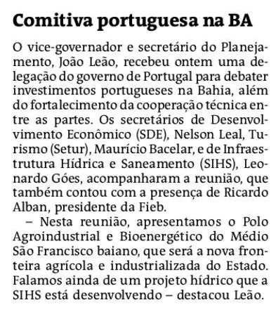 O governo da Bahia recebeu nessa quarta-feira (26), uma delegação do Governo de Portugal. Na pauta, foram discutidos investimentos portugueses na Bahia, fortalecimento da cooperação técnica e internacional entre o país europeu e o governo baiano, projetos de turismo e de infraestrutura hídrica. O vice-governador, João Leão, acompanhado dos secretários de Desenvolvimento Econômico (SDE), Nelson Leal, Turismo (Setur), Maurício Bacelar, e de Infraestrutura Hídrica e Saneamento (SIHS), Leonardo Góes, participaram da reunião, que também contou com a presença de Ricardo Alban, presidente da Federação das Indústrias da Bahia (Fieb).